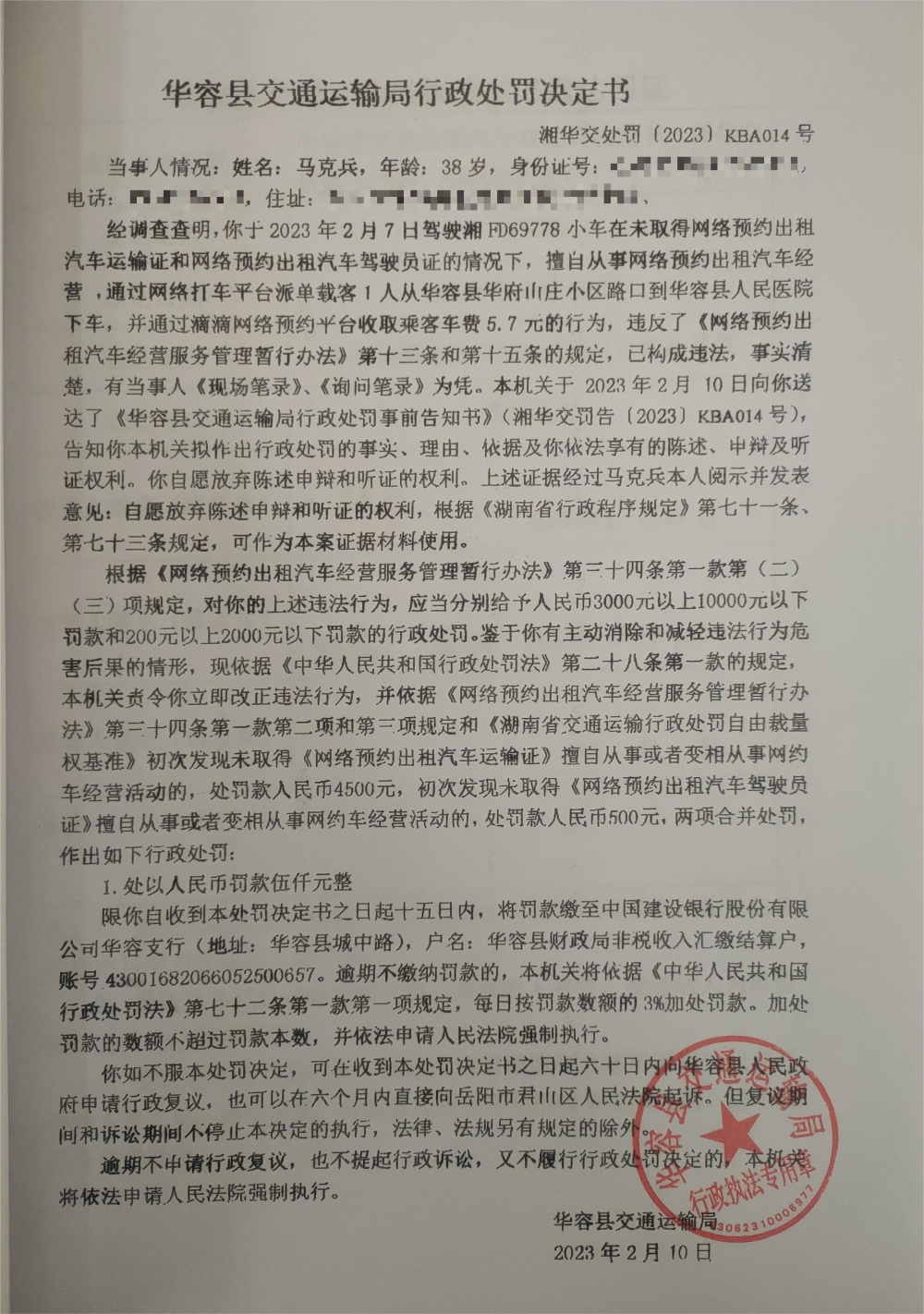 马克兵擅自从事网络预约出租汽车经营的行政处罚公示(湘华交处罚[2023]KBA014号)