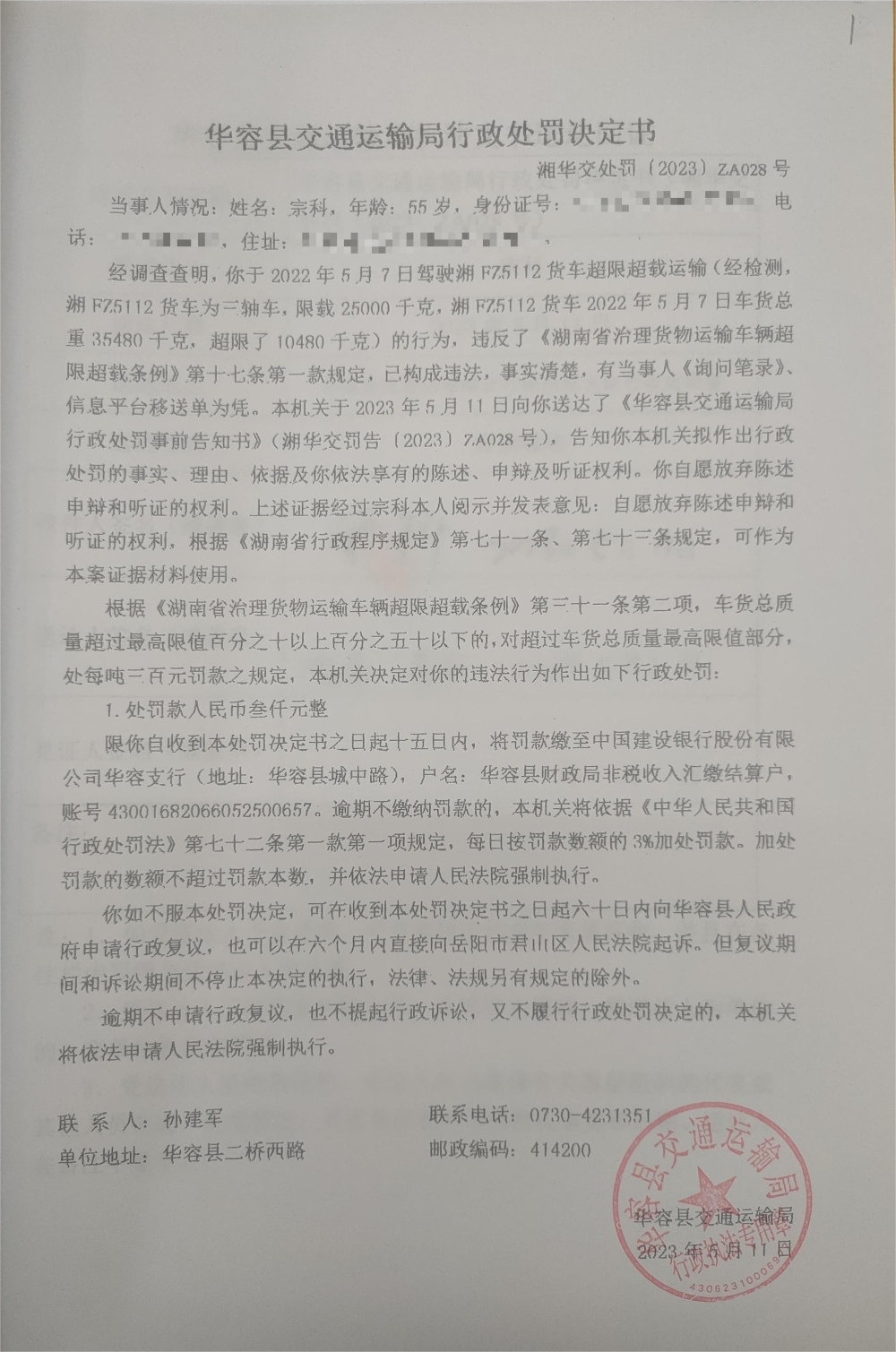 宗科驾驶货车超限超载运输的行政处罚公示(湘华交处罚[2023]ZA028号)