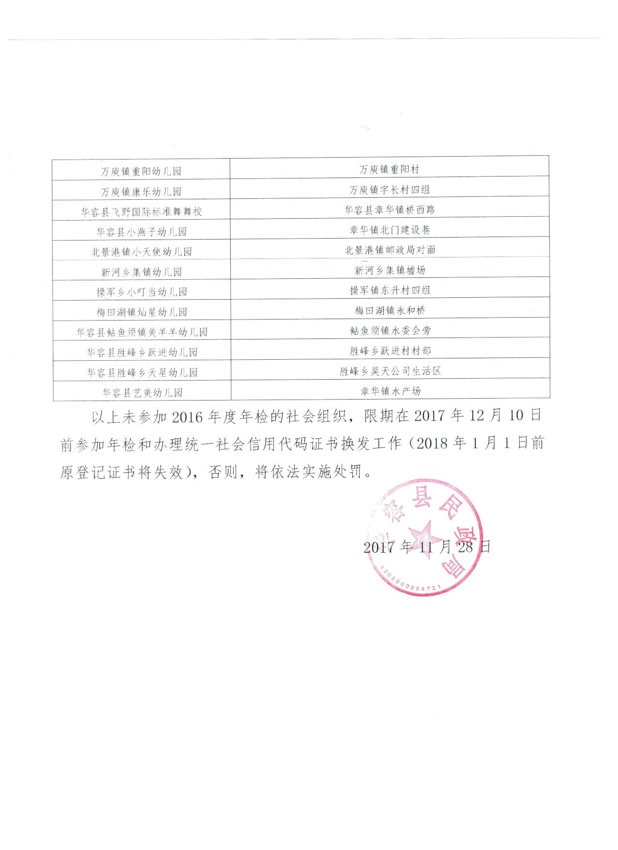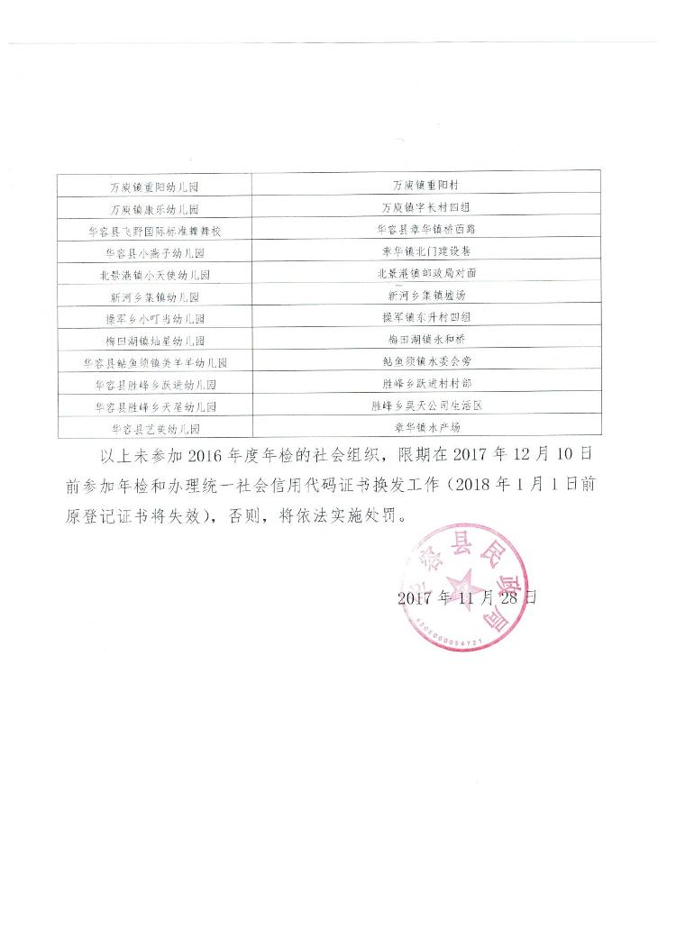 以上未参加2016年度年检的社会组织,限期在2017年12月10日前参加年检和办理统一社会信用代码证书换发工作(2018年1月1日前原登记证书将失效),否则,将依法实施处罚。