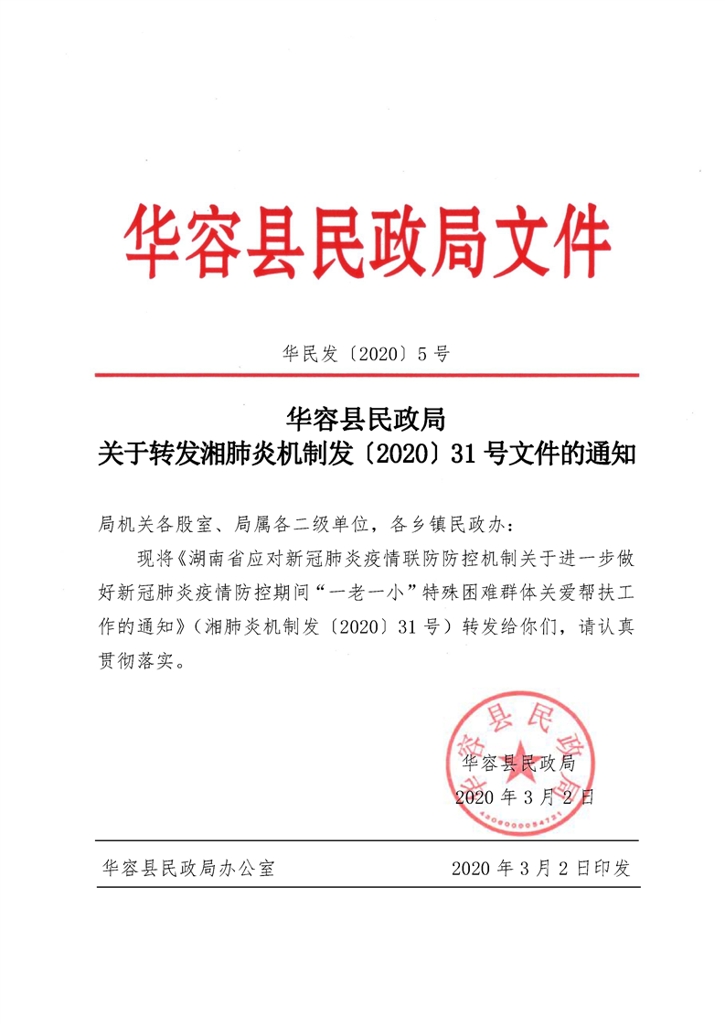 华容县民政局 关于转发湘肺炎机制发〔2020〕31号文件的通知