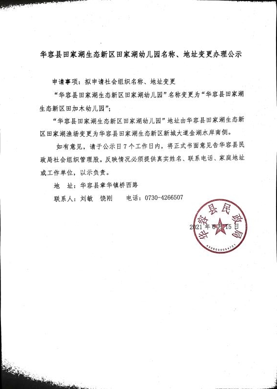 华容县田家湖生态新区田家湖幼儿园名称、地址变更办理公示