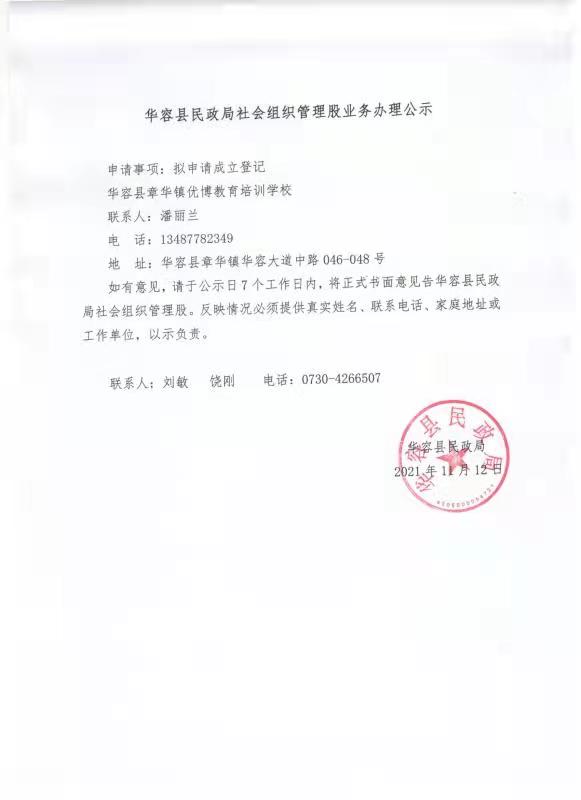 华容县民政局社会组织管理股业务办理公示(优博教育)
