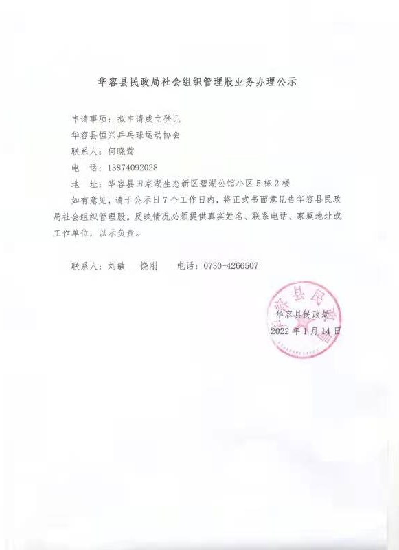 华容县民政局社会组织管理股业务办理公示(恒兴)