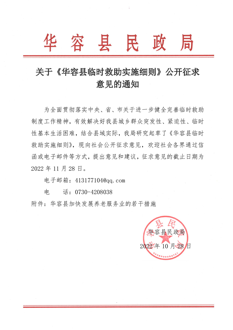 关于《华容县临时救助实施细则》公开征求意见的通知