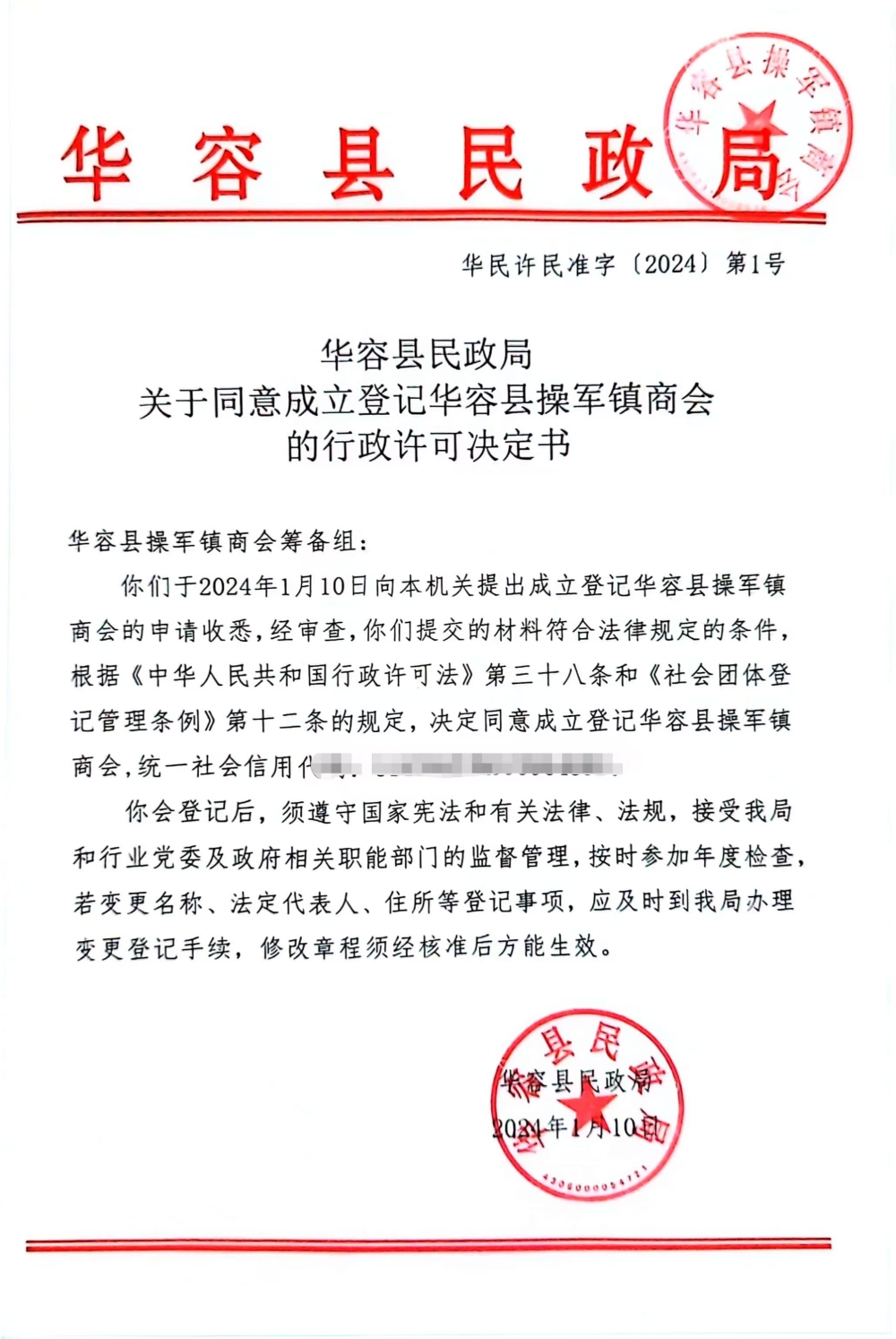 华容县民政局关于同意成立登记华容县操军镇商会的行政许可决定书