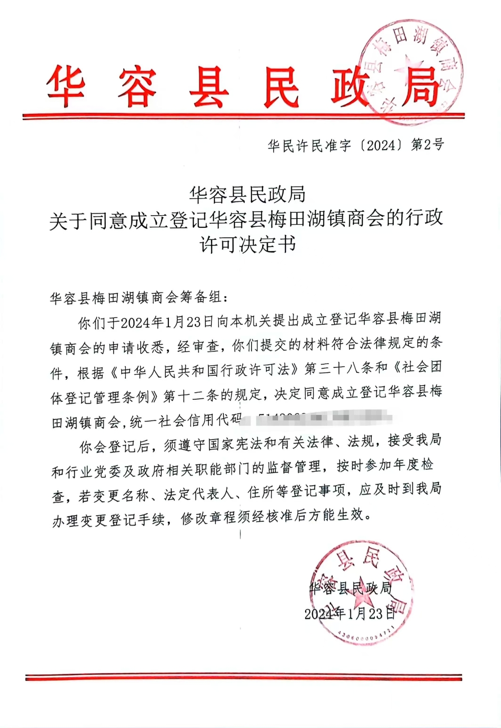 华容县民政局关于同意成立登记华容县梅田湖镇商会的行政许可决定书