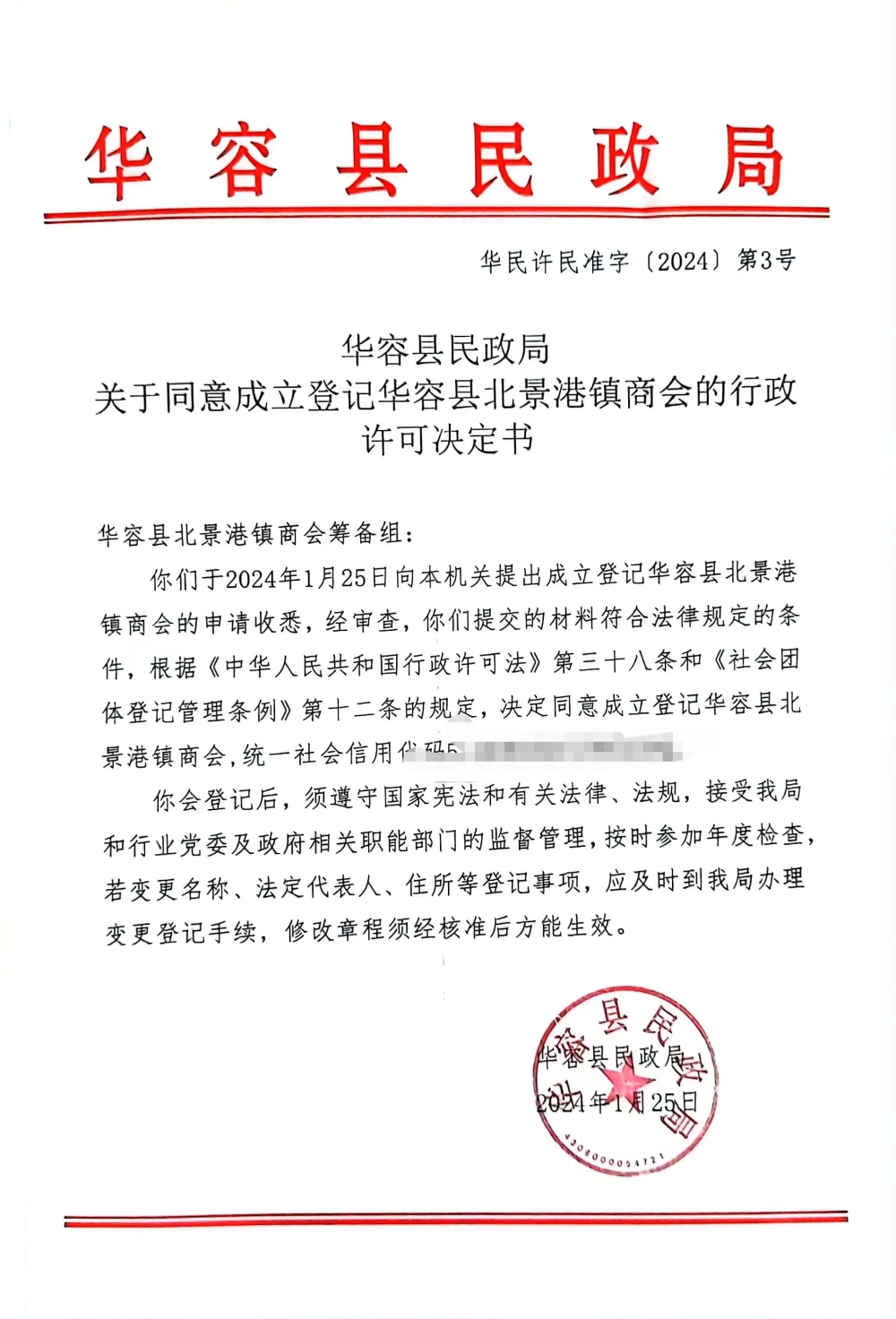 华容县民政局关于同意成立登记华容县北景港镇商会的行政许可决定书
