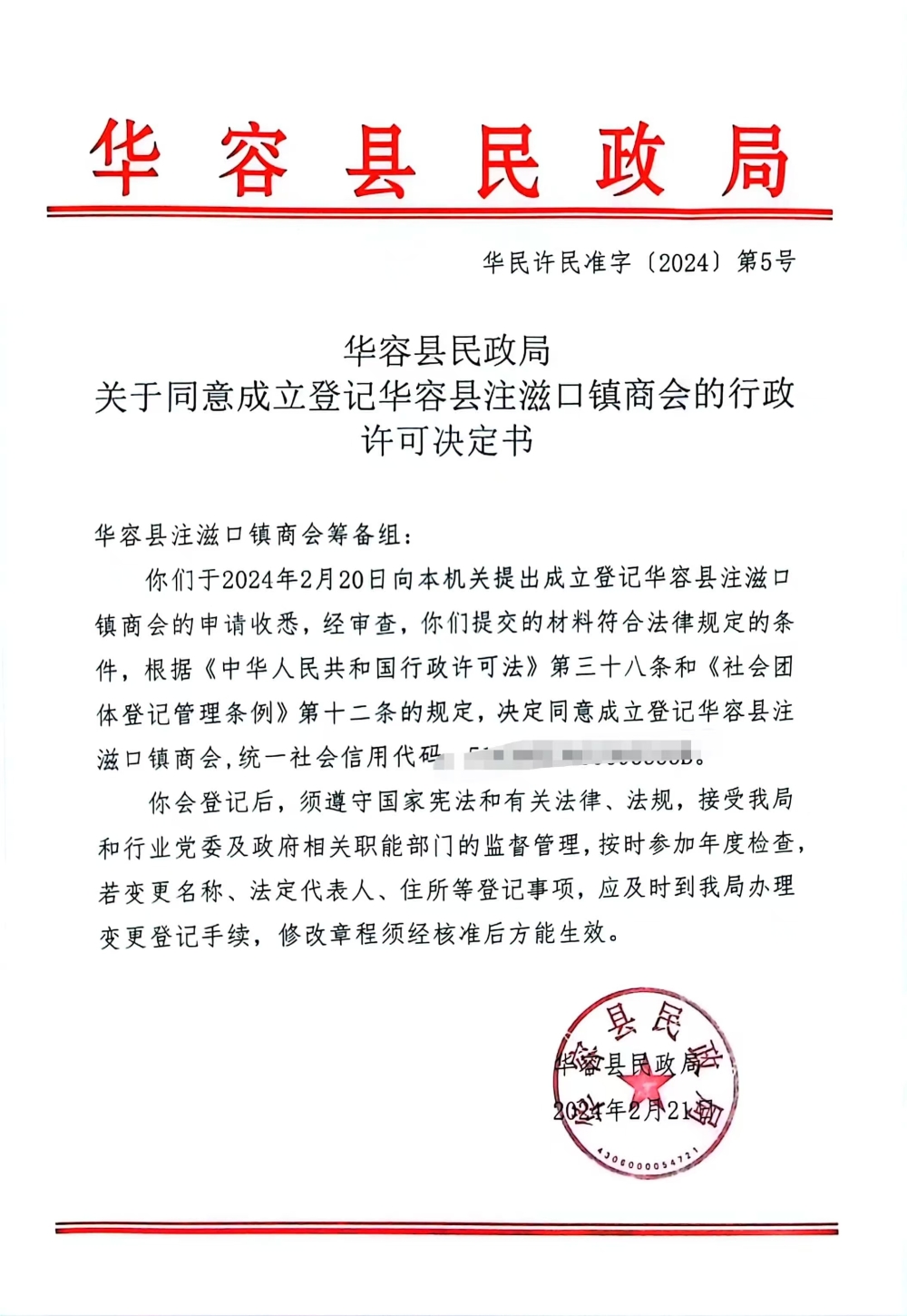 华容县民政局关于同意成立登记华容县注滋口镇商会的行政许可决定书
