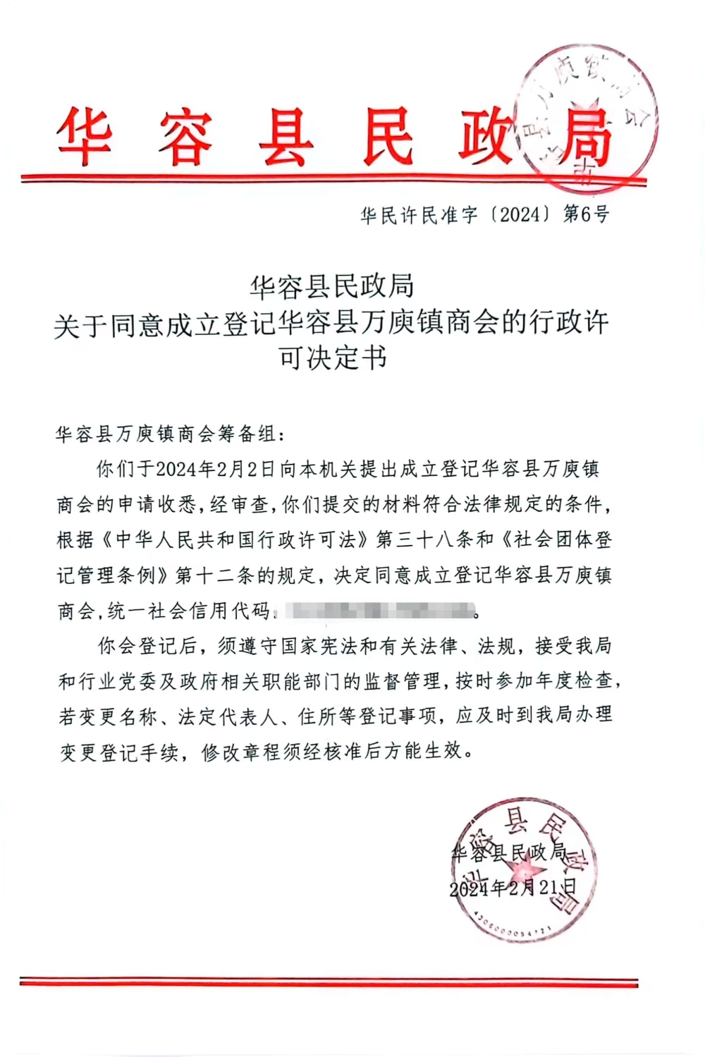 华容县民政局关于同意成立登记华容县万庾镇商会的行政许可决定书