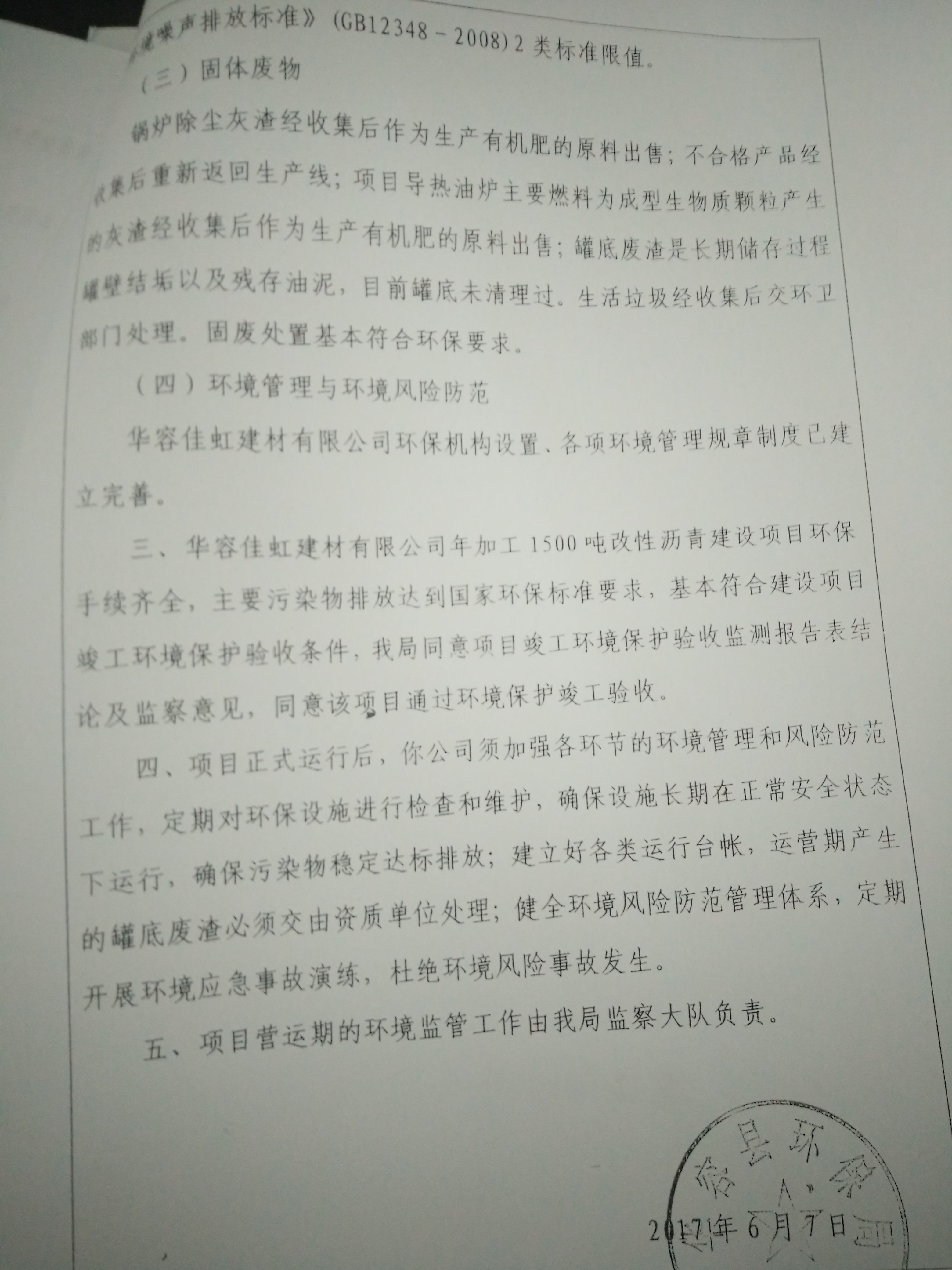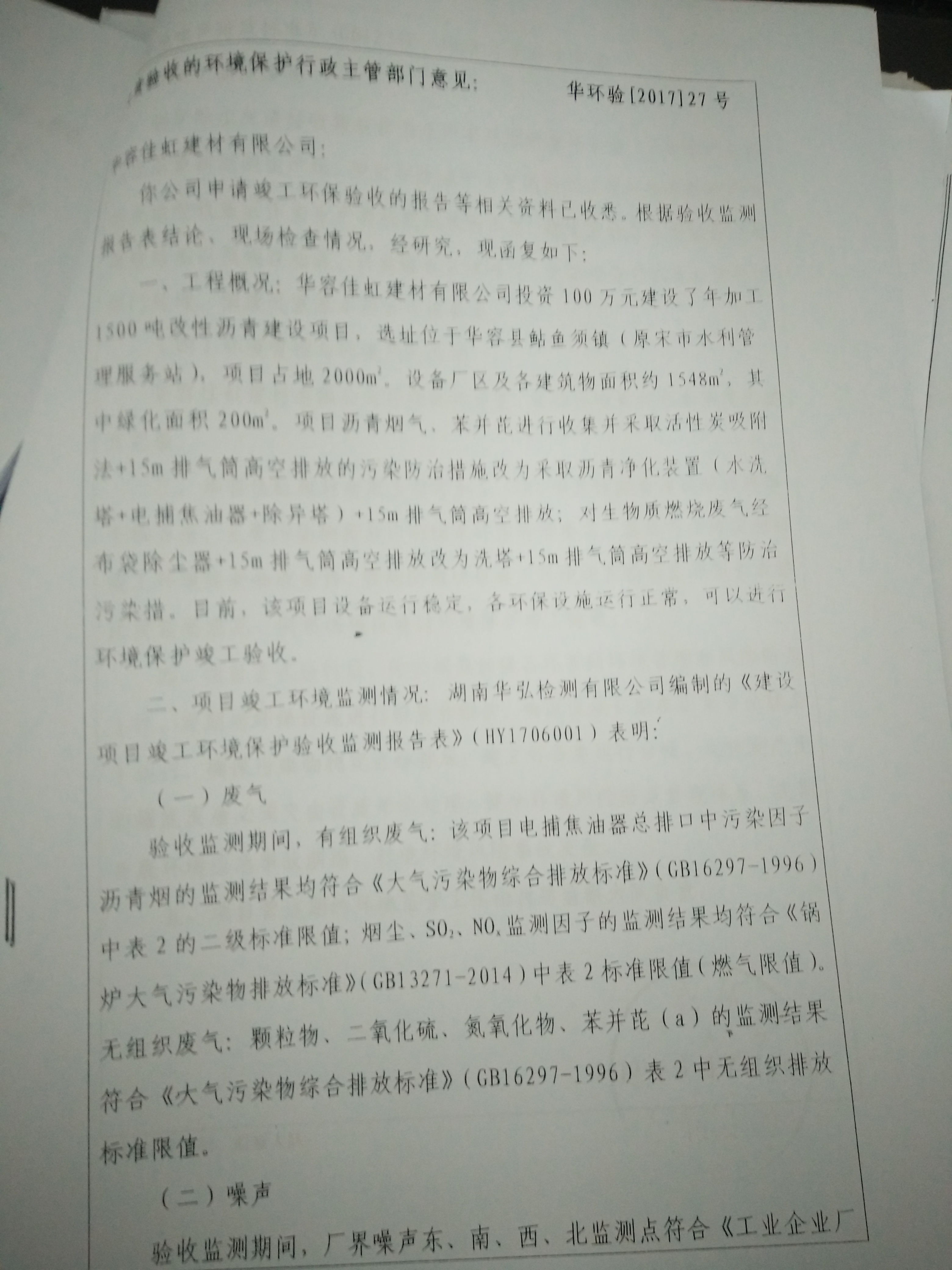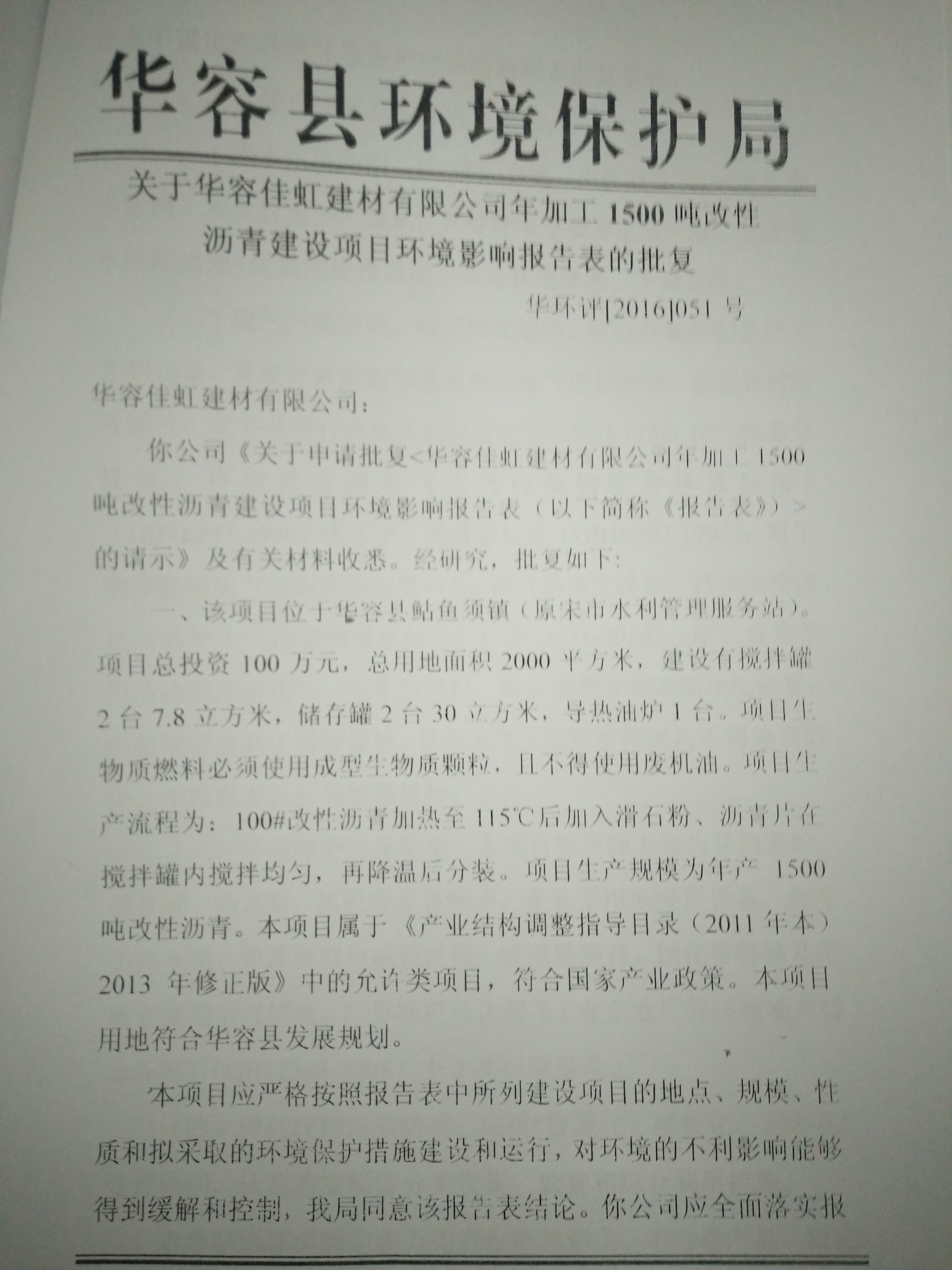 华容县佳虹建材有限公司年加工1500吨改性沥青建设项目环境影响报告表的批复