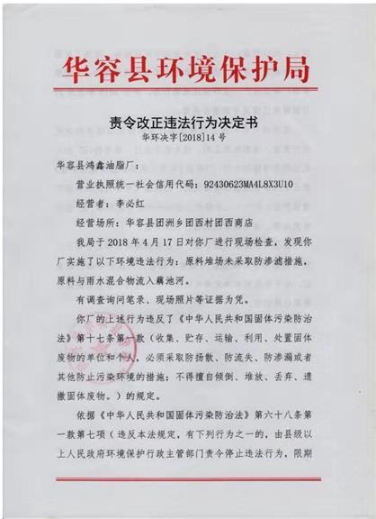 华容县鸿鑫油脂厂华环决字[2018]14号责令改正违法行为决定书