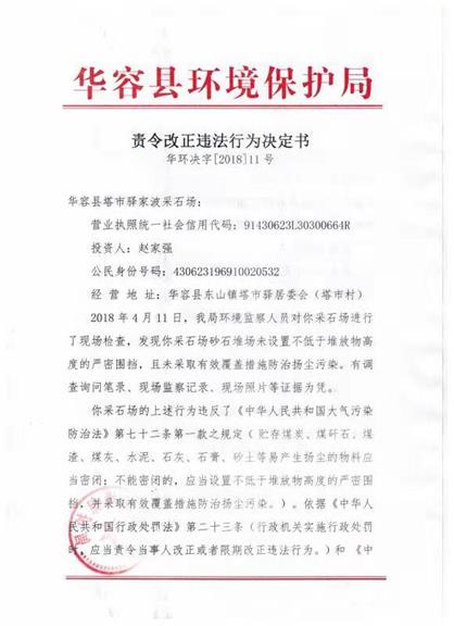 华容县塔市驿家波采石场华环决字[2018]11号责令改正违法行为决定书