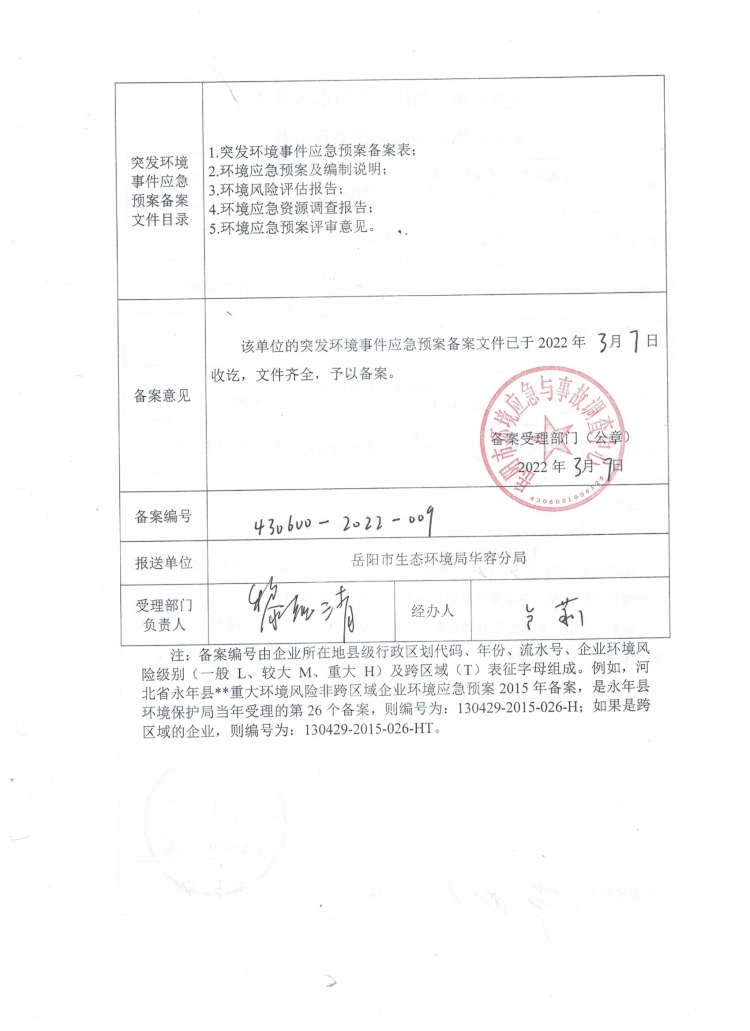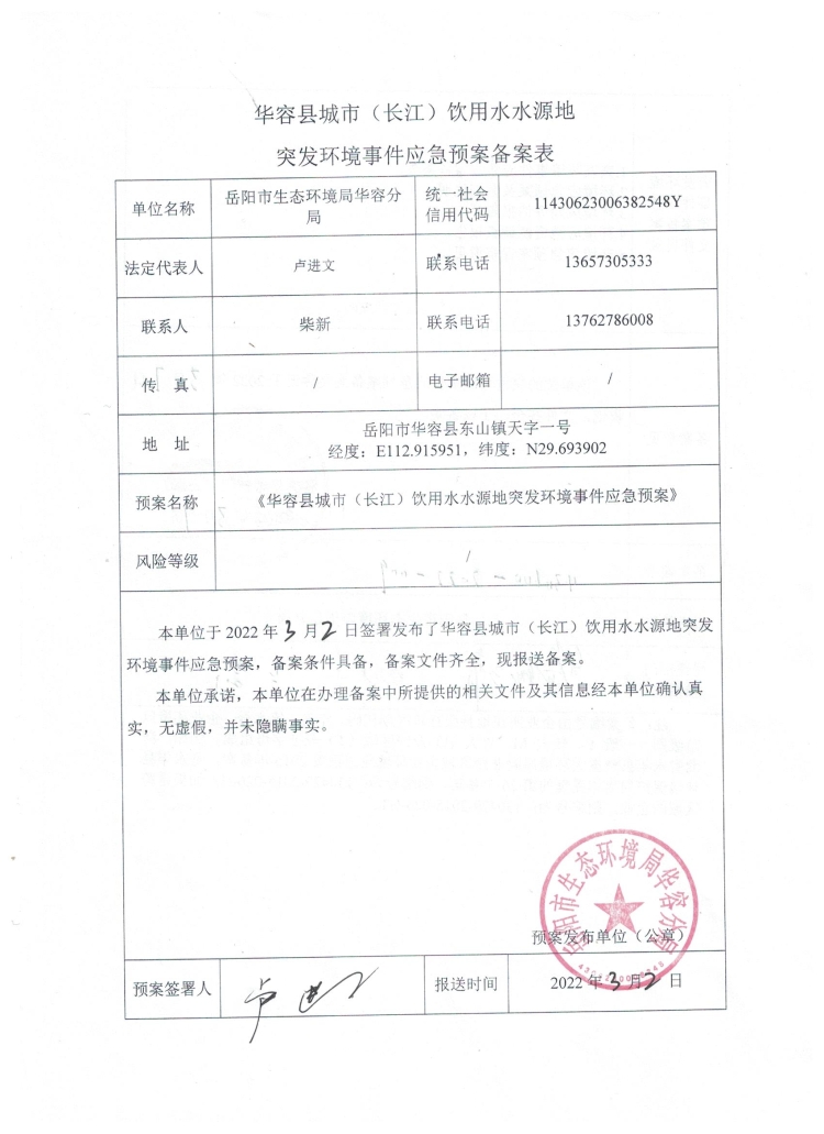 华容县城市(长江)饮用水水源地突发环境事件应急预备案表