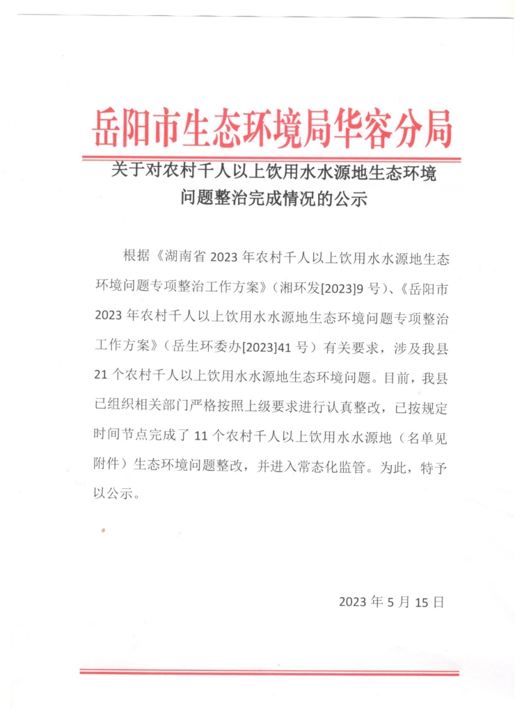 关于对农村千人以上饮用水水源地生态环境问题整治完成情况的公示