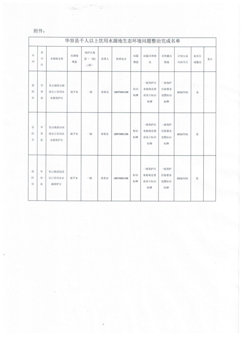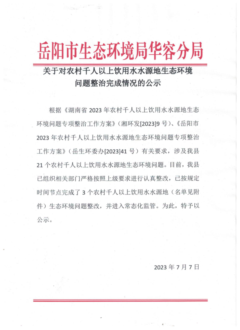 关于对农村千人以上饮用水水源地生态环境问题整治完成情况的公示