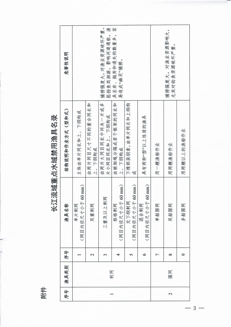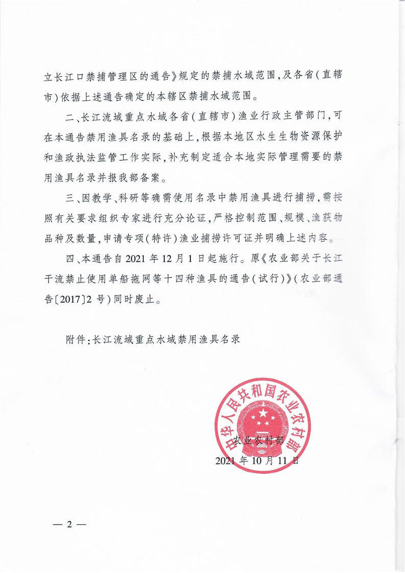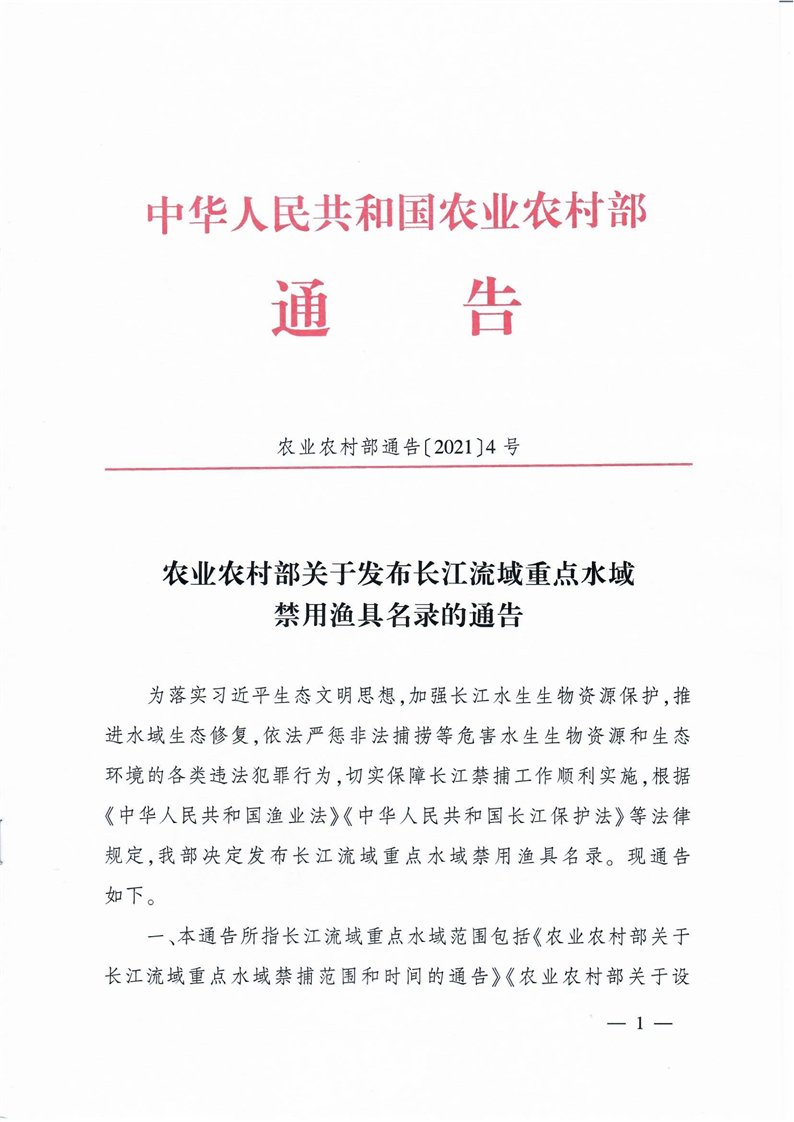 农业农村部关于发布长江流域重点水域禁用渔具名录的通告