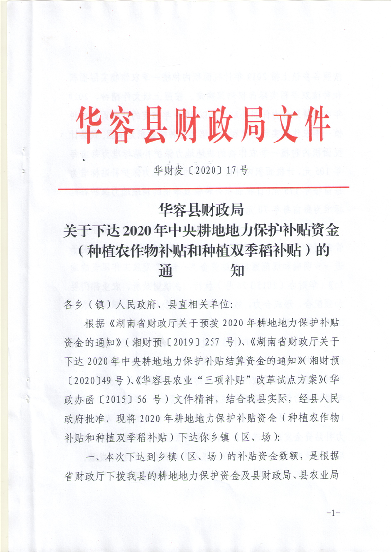 关于下达2020年中央耕地地力保护补贴资金(种植农作物补贴和种植双季稻补贴)的通知