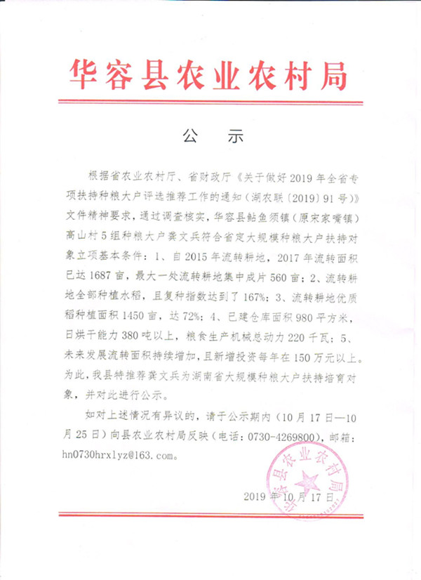 关于推荐龚文兵为湖南省大规模种粮大户培育扶持对象公示