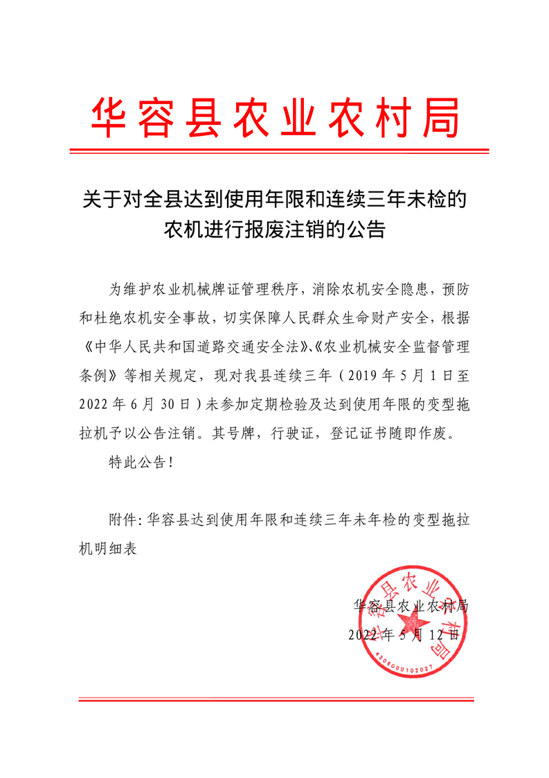 关于对全县达到使用年限和连续三年未检的农机进行报废注销的公告