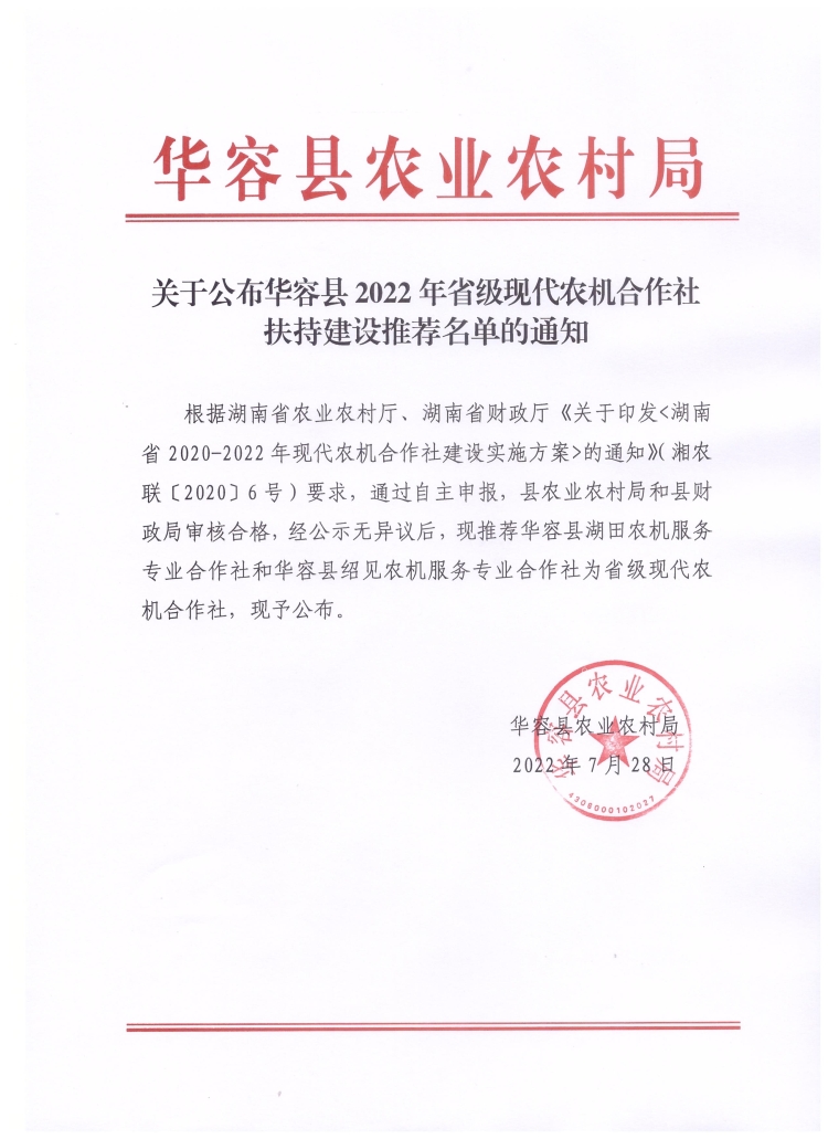 关于华容县2022年省级现代农机合作社扶持建设推荐名单的通知