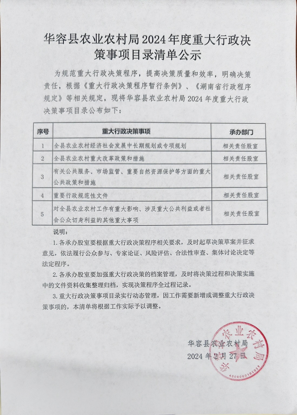 华容县农业农村局2024年度重大行政决策事项目录清单公示