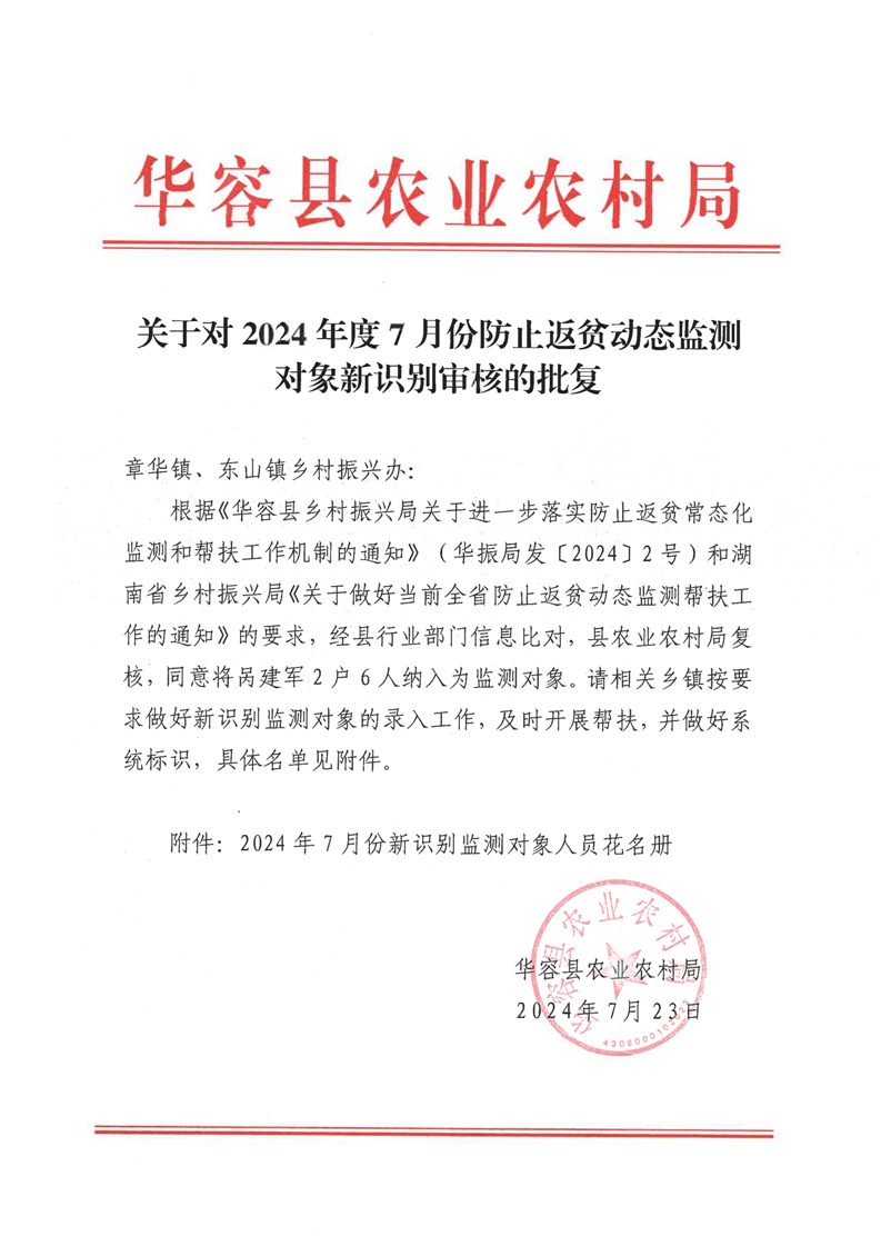 关于对2024年7月份防止返贫动态监测对象新识别审核的批复