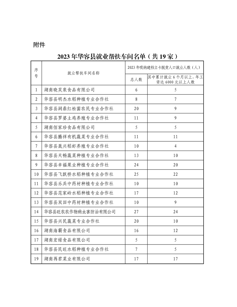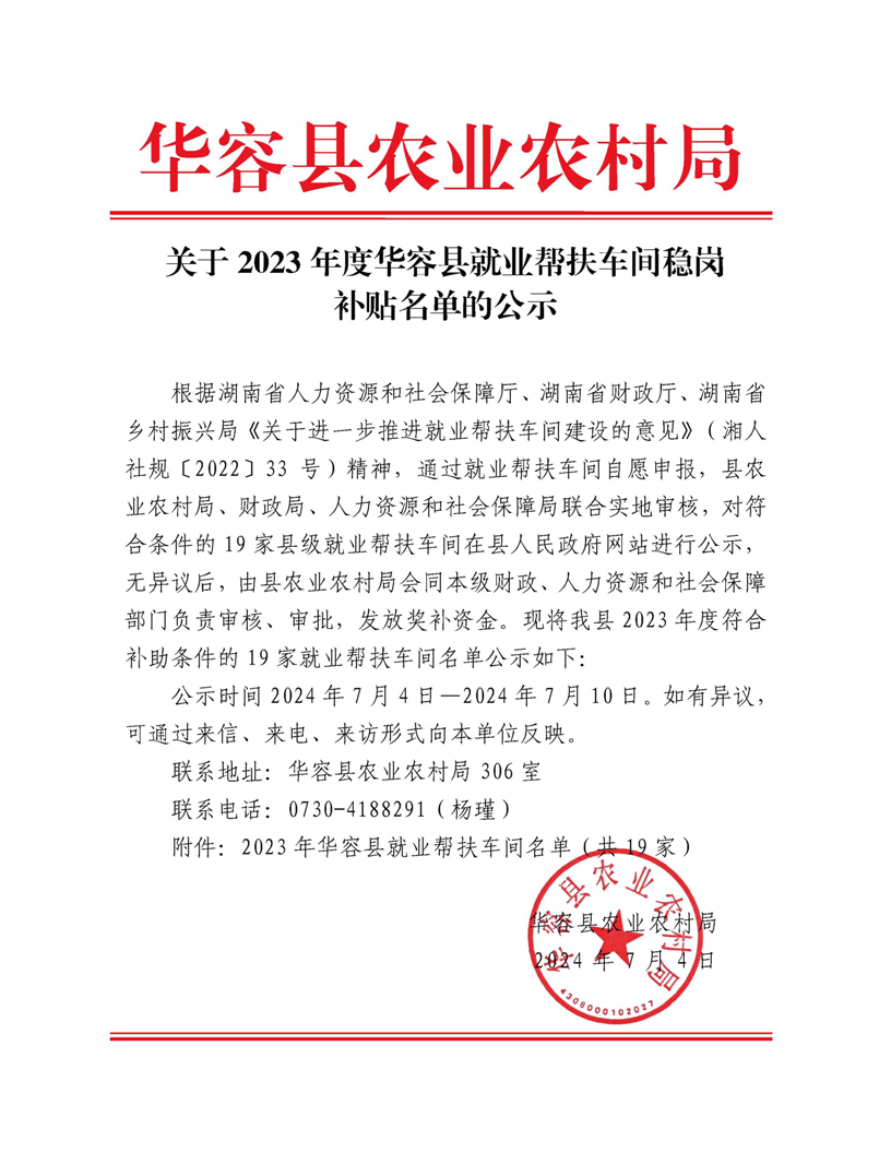 关于2023年度华容县就业帮扶车间稳岗补贴名单的公示