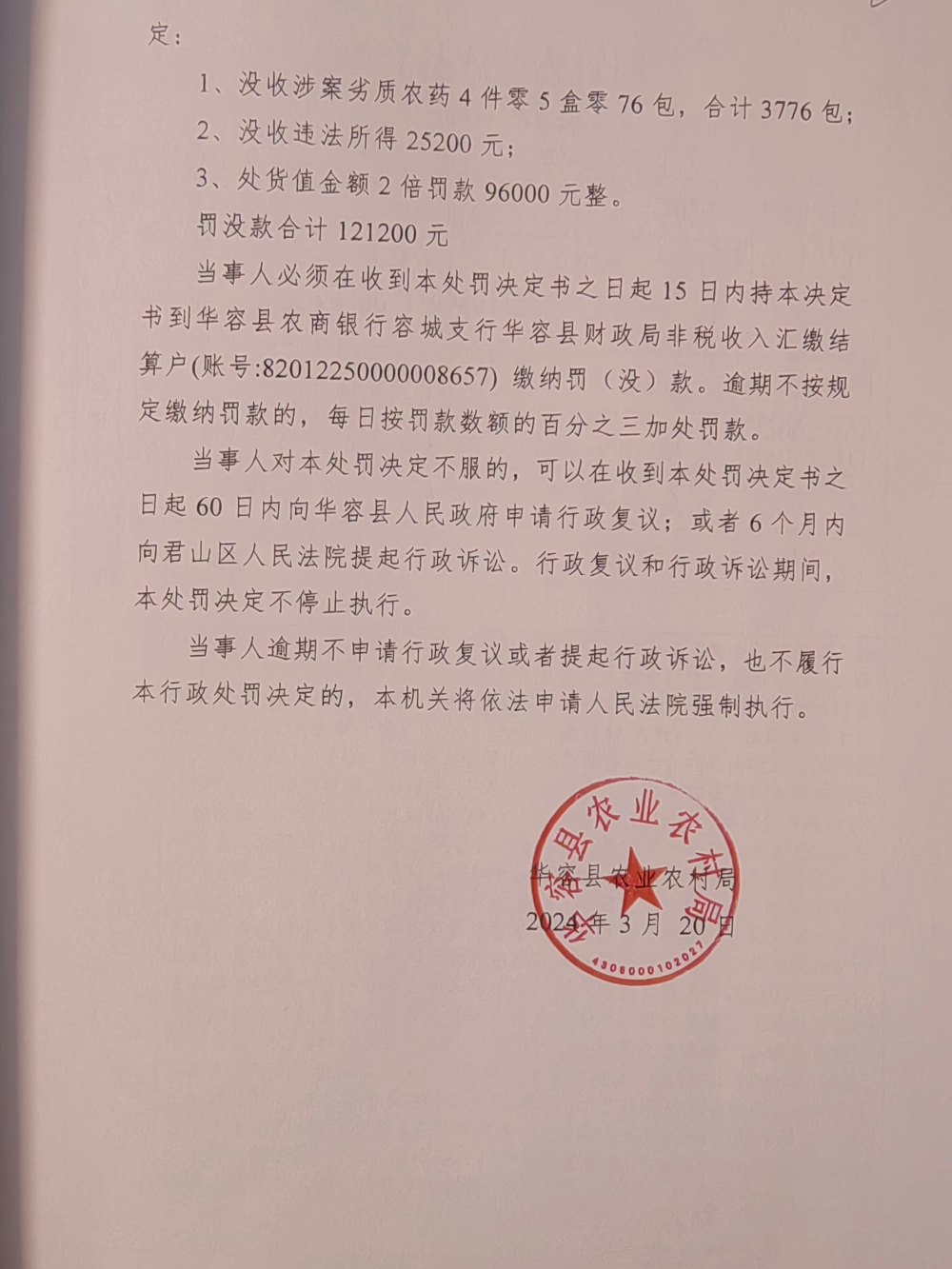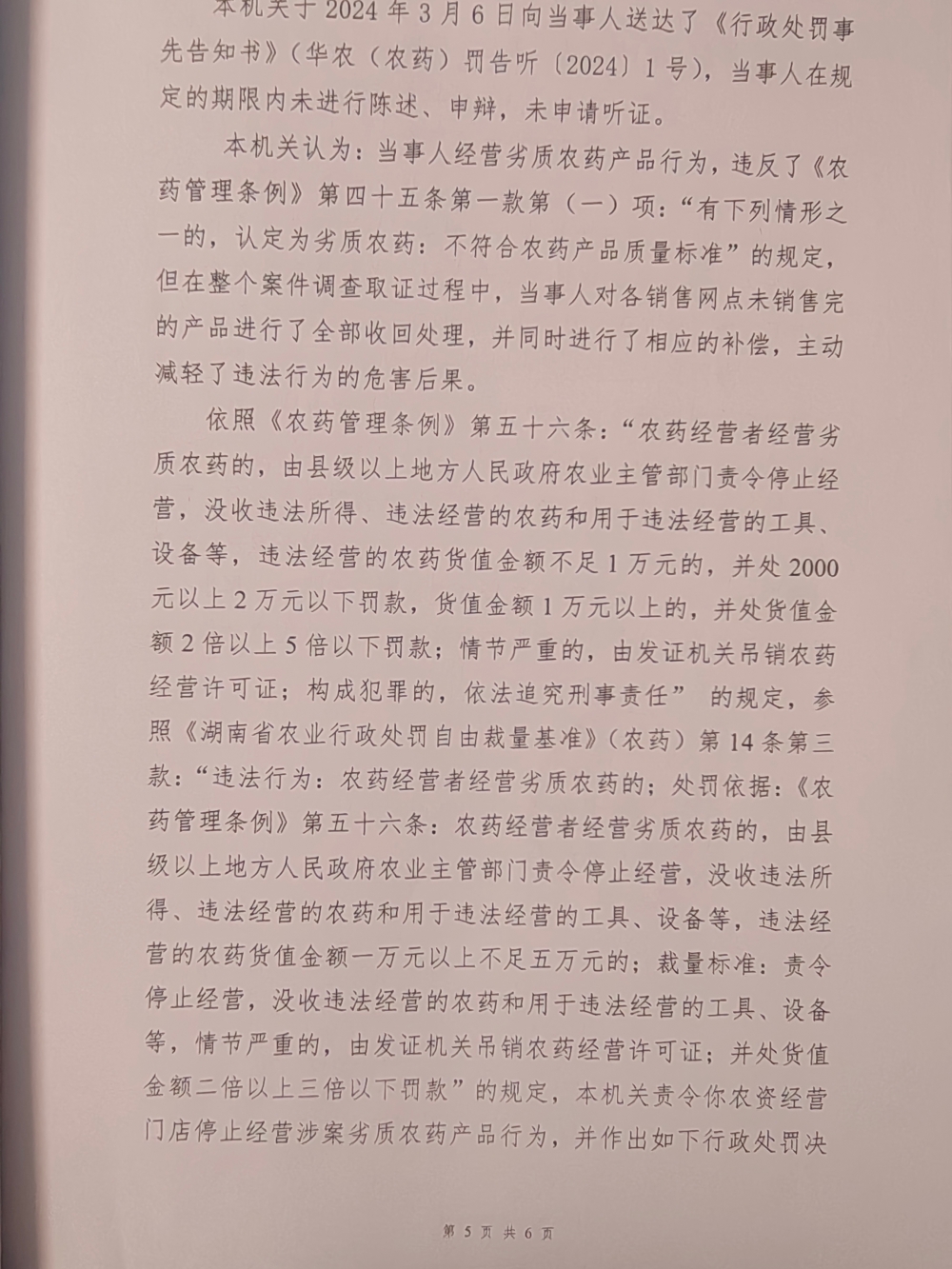 华容县农业农村局行政处罚决定书 华农(农药)罚〔2024〕1号