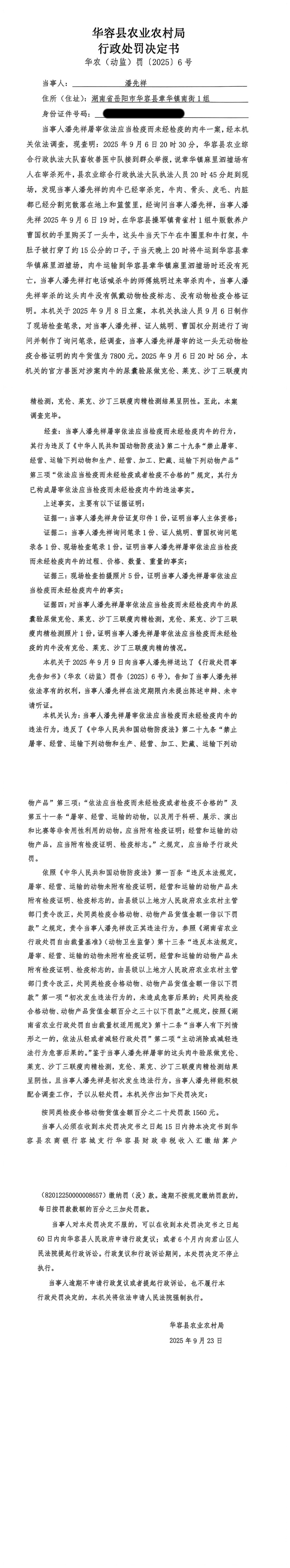 华容县农业农村局行政处罚决定书 华农(动监)罚〔2025〕6号