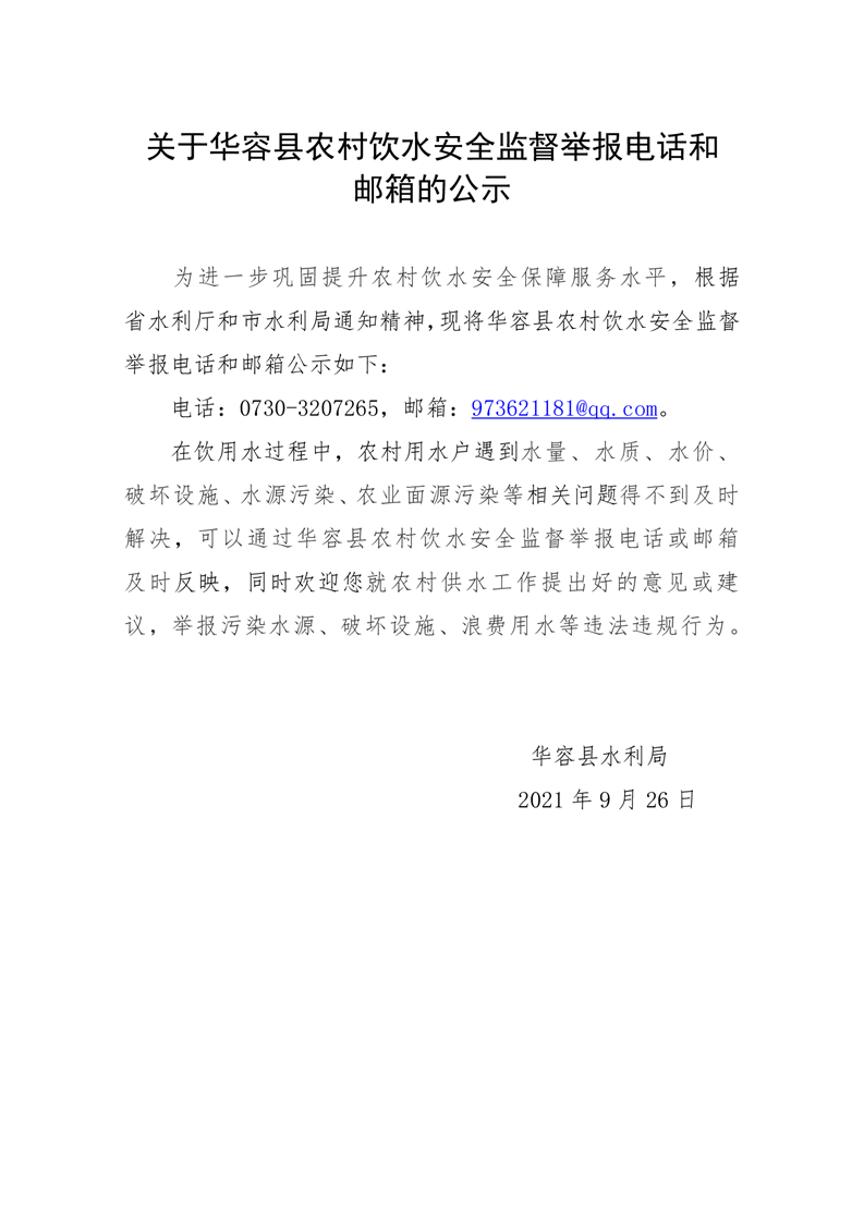 关于华容县农村饮水安全监督举报电话和邮箱的公示