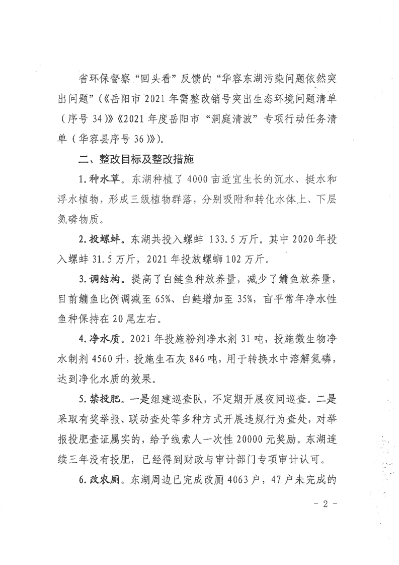 关于2020年省生态环境保护督察“回头看”反馈“华容县东湖污染依然突出”问题整改完成情况的公示