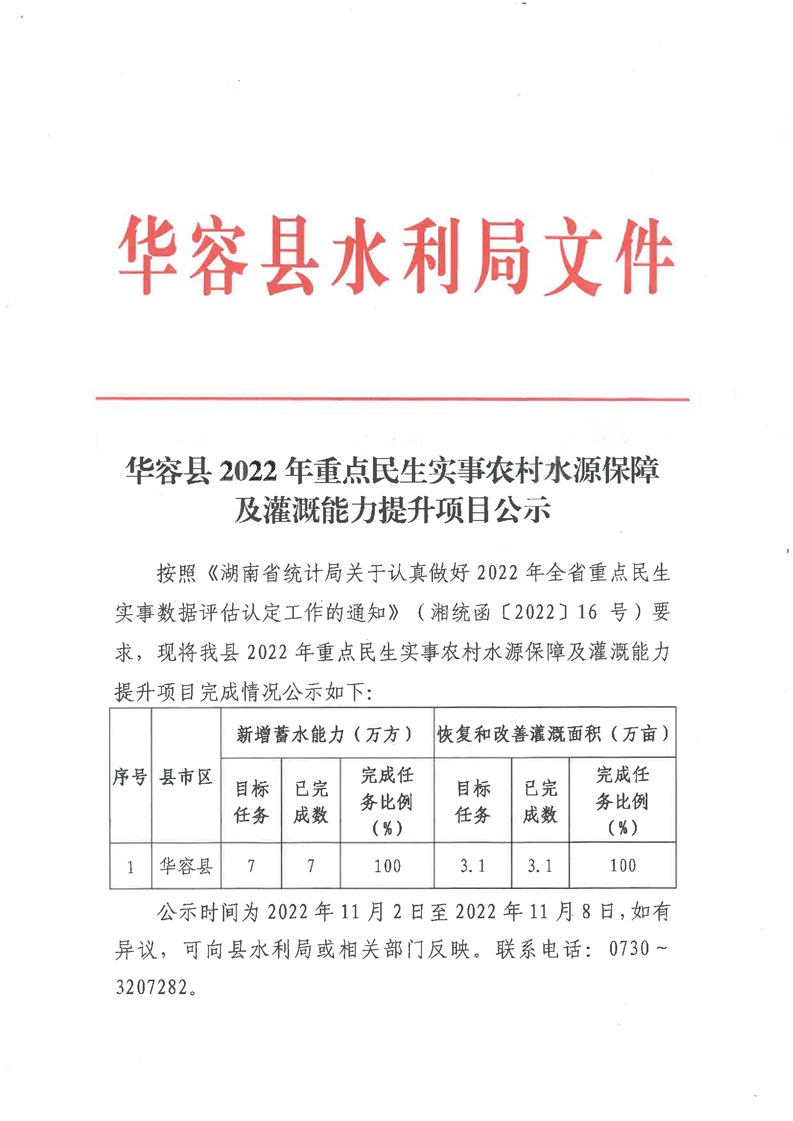 华容县2022年重点民生实事农村水源保障及灌溉能力提升项目公示