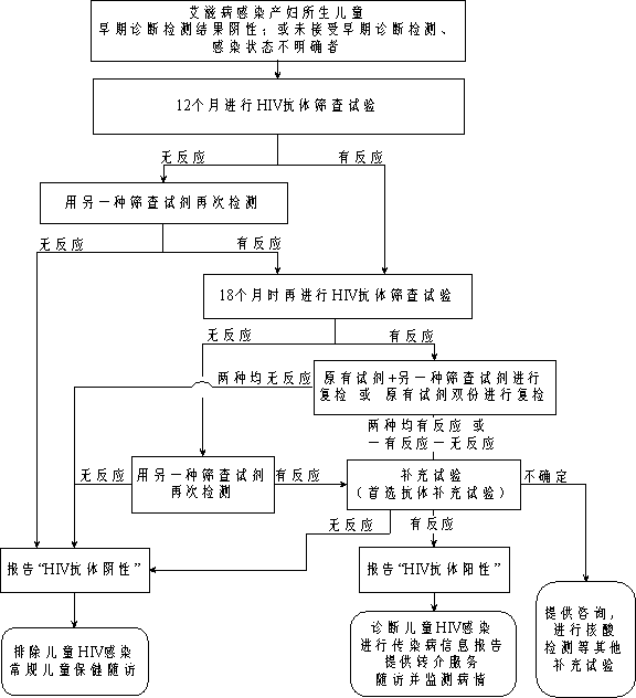 (3)为艾滋病感染孕产妇所生儿童提供检测。按照《婴儿艾滋病感染早期诊断工作方案》(国卫妇幼妇卫便函〔2014〕27号)相关技术和时间要求,对所生儿童于出生后6周和3个月时,分别采集血标本,进行婴儿感染早期诊断(详见附件3-图6婴儿艾滋病感染早期诊断及服务流程)。未进行婴儿早期诊断检测或婴儿早期诊断检测结果为阴性的儿童,应于12、18月龄进行艾滋病抗体筛查及必要的补充试验,以明确艾滋病感染状态(艾滋病感染孕产妇所生儿童艾滋病抗体检测及服务流程附件3-图7)。
