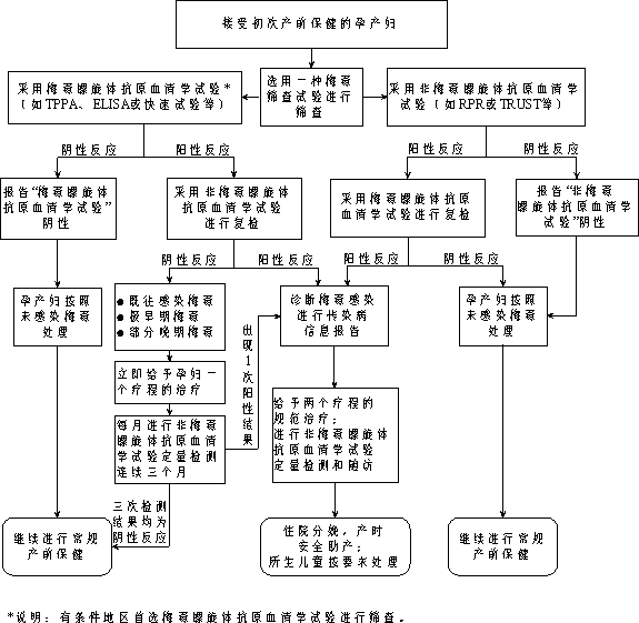(2)梅毒的检测。各医疗卫生机构在孕产妇初次接受孕产期保健时,应主动提供1次免费梅毒筛查服务。提供孕产期保健服务医疗卫生机构要具备非梅毒螺旋体抗原血清学试验和梅毒螺旋体抗原血清学试验的能力,原则上首选梅毒螺旋体抗原血清学试验进行筛查,筛查结果呈阳性反应者,应在本机构立即用同一标本采用另一类检测方法进行复检,确定其是否为梅毒感染。(孕产妇梅毒检测及服务流程详见附件2-图4)。