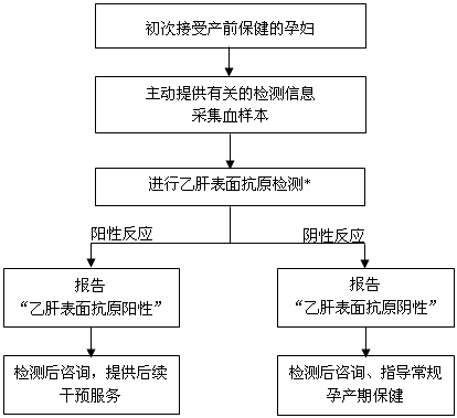 (3)乙肝的检测。各级医疗卫生机构在孕产妇初次接受孕产期保健时,应主动提供1次免费乙肝表面抗原检测服务。检测结果阳性,继而进行乙肝病毒感染血清学标志物(两对半)等相关检测(孕产妇乙肝检测及服务流程详见附件2-图5)。
