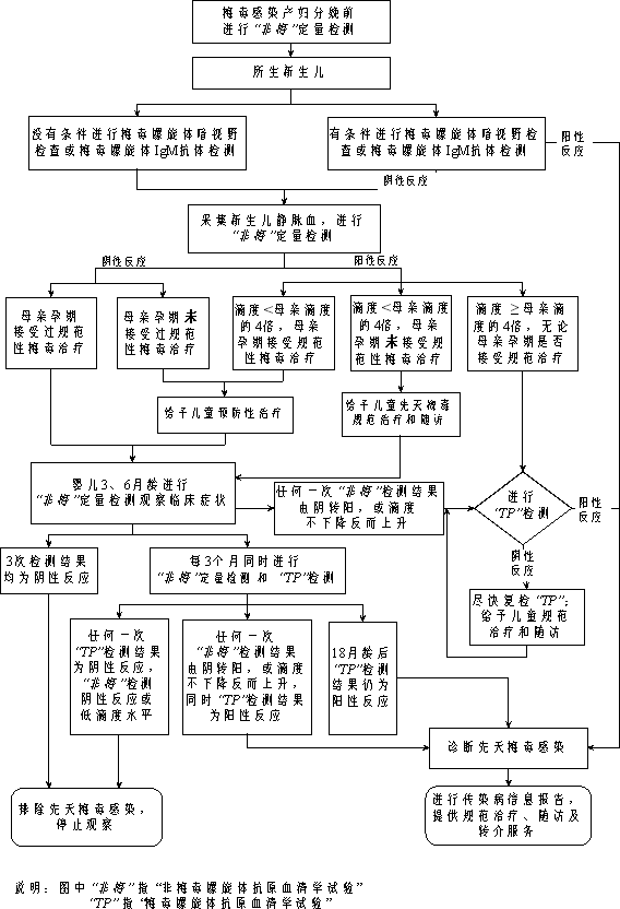 (3)为梅毒感染孕产妇所生儿童提供先天梅毒的诊断与治疗。各医疗卫生机构对梅毒感染孕产妇所生儿童出生时即进行梅毒感染相关检测,及时发现先天梅毒患儿。对出生时明确诊断的先天梅毒儿童及时给予规范治疗,并上报先天梅毒感染信息;在没有条件或无法进行先天梅毒诊断、治疗的情况下应及时进行转诊;对出生时不能明确诊断先天梅毒的儿童,由县妇幼保健院指定专人定期随访,及时诊断或排除先天梅毒;对随访过程中诊断的先天梅毒儿童及时给予规范治疗并上报先天梅毒感染信息。
