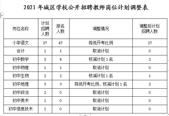 关于调整2021年城区学校公开招聘教师部分岗位 计划数的公告