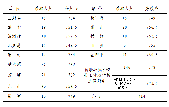 说明:1.调剂录取时,5个单位未完成分配录取计划17个名额在全县调剂录取,调剂录取最低分773.5分,调剂录取17人。