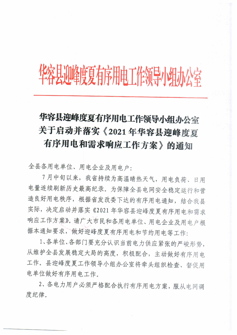 关于启动并落实《2021年华容县迎峰度夏有序用电和需求响应工作方案》的通知