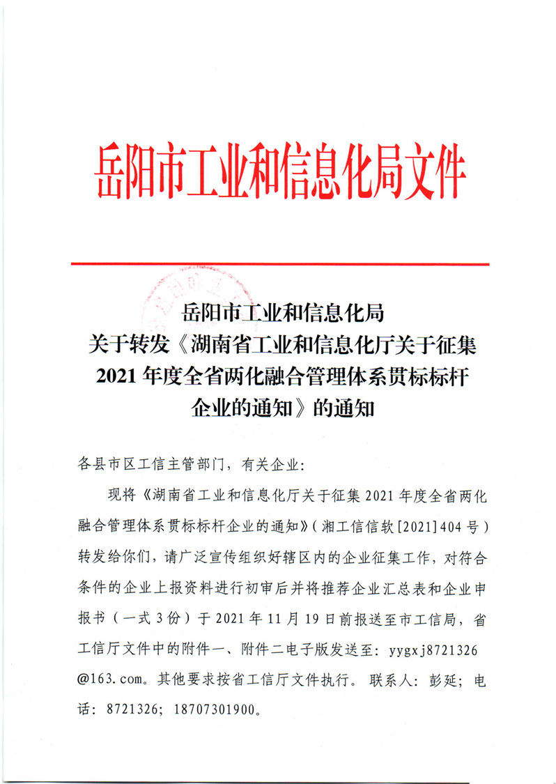 岳阳市工业和信息化局关于转发《湖南省工业和信息化厅关于征集2021年度全省两化融合管理体系贯标标杆企业的通知》的通知