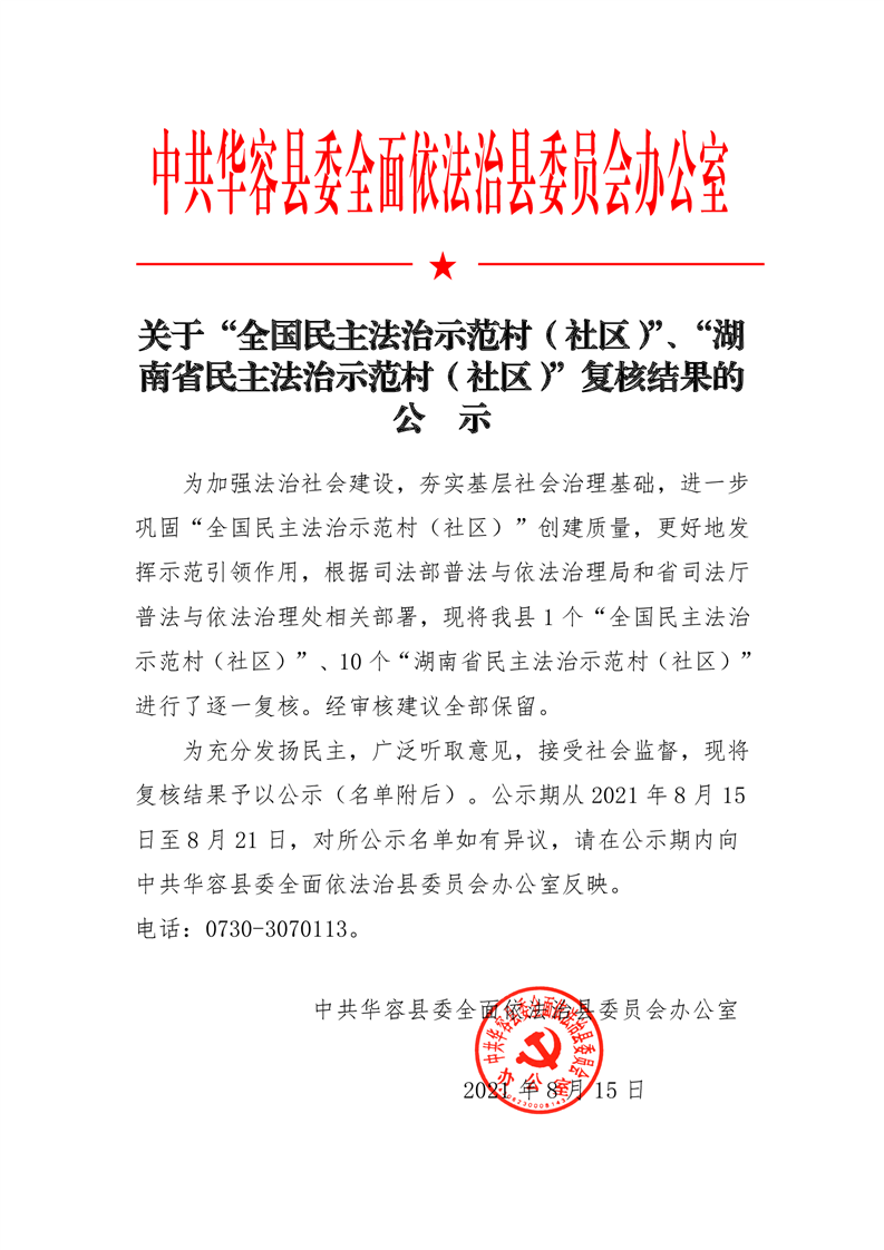 关于“全国民主法治示范村(社区)、”“湖南省民主法治示范村(社区)”复核结果的公示