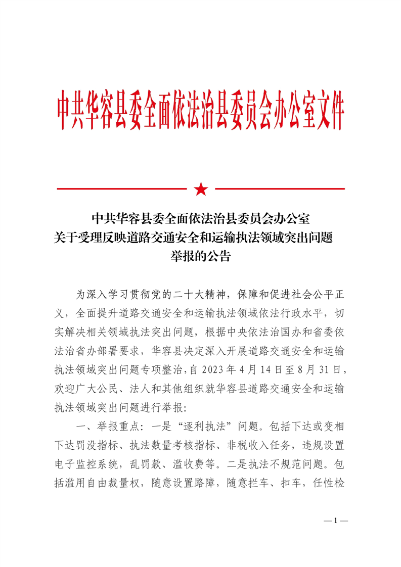 关于受理反映道路交通安全和运输执法领域突出问题 举报的公告