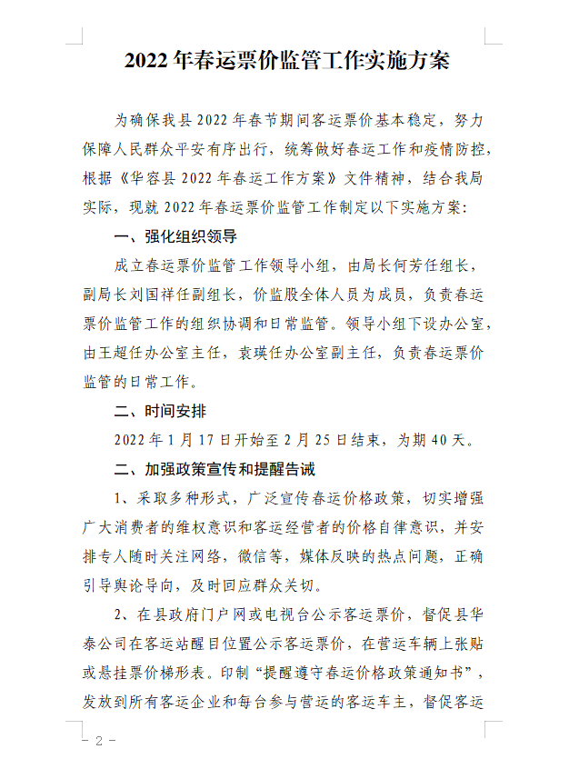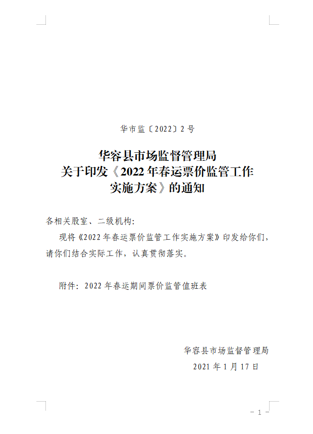 华容县市场监督管理局 关于印发《2022年春运票价监管工作 实施方案》的通知