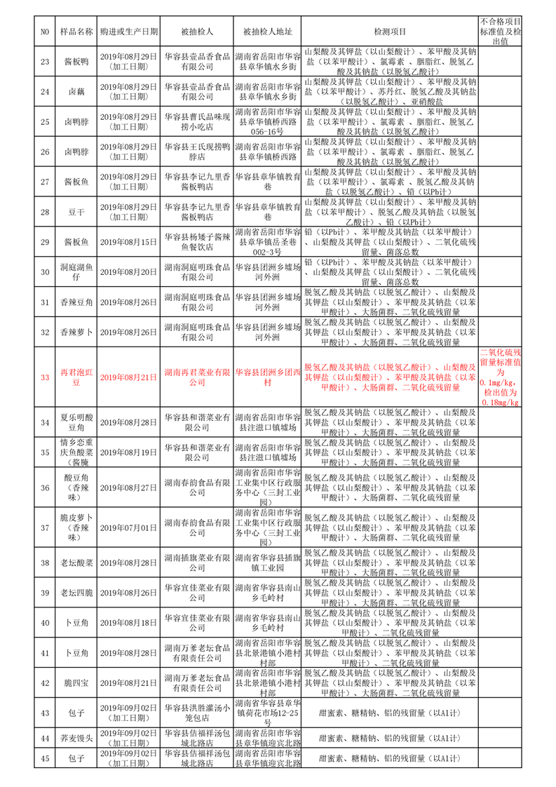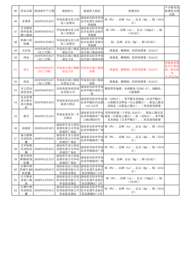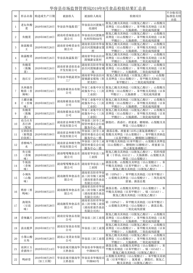 华容县市场监督管理局2019年8月食品检验结果汇总表