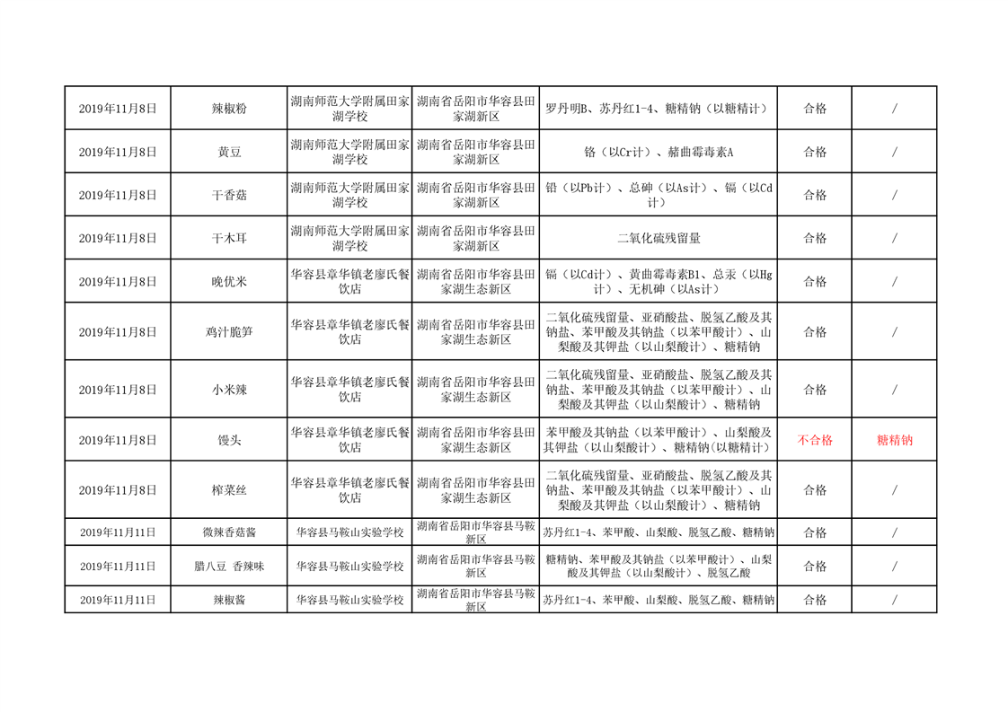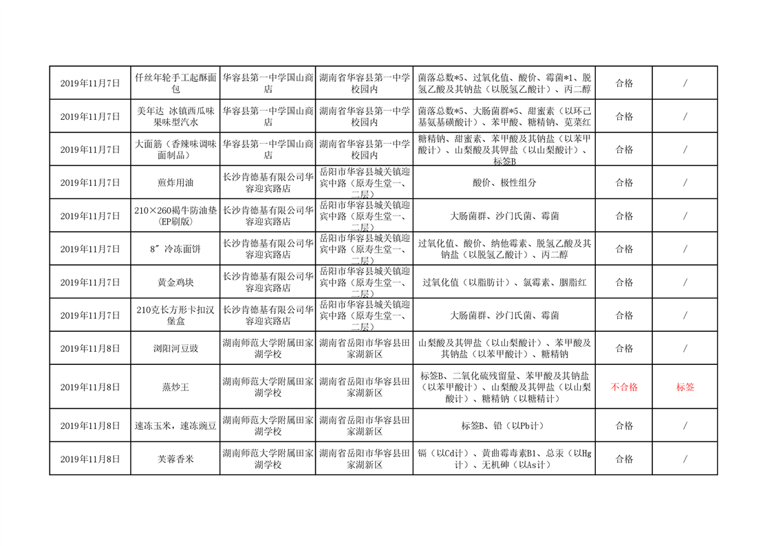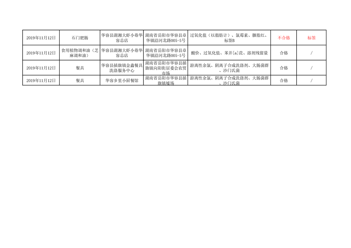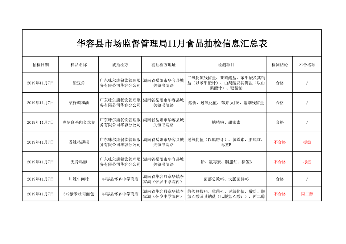 华容县市场监督管理局11月食品抽检信息汇总表