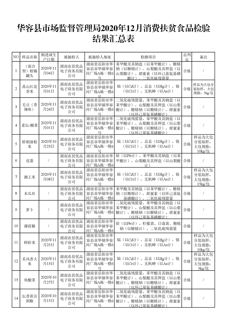 华容县市场监督管理局2020年12月消费扶贫食品检验结果汇总表