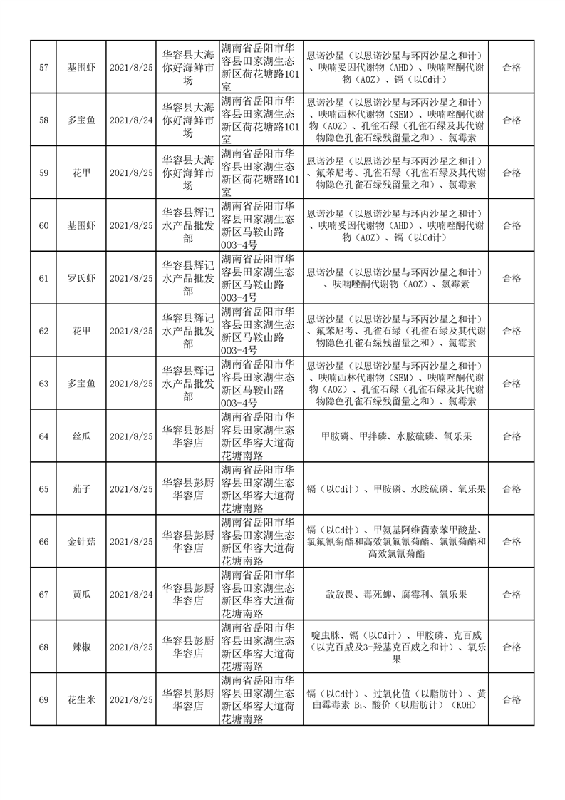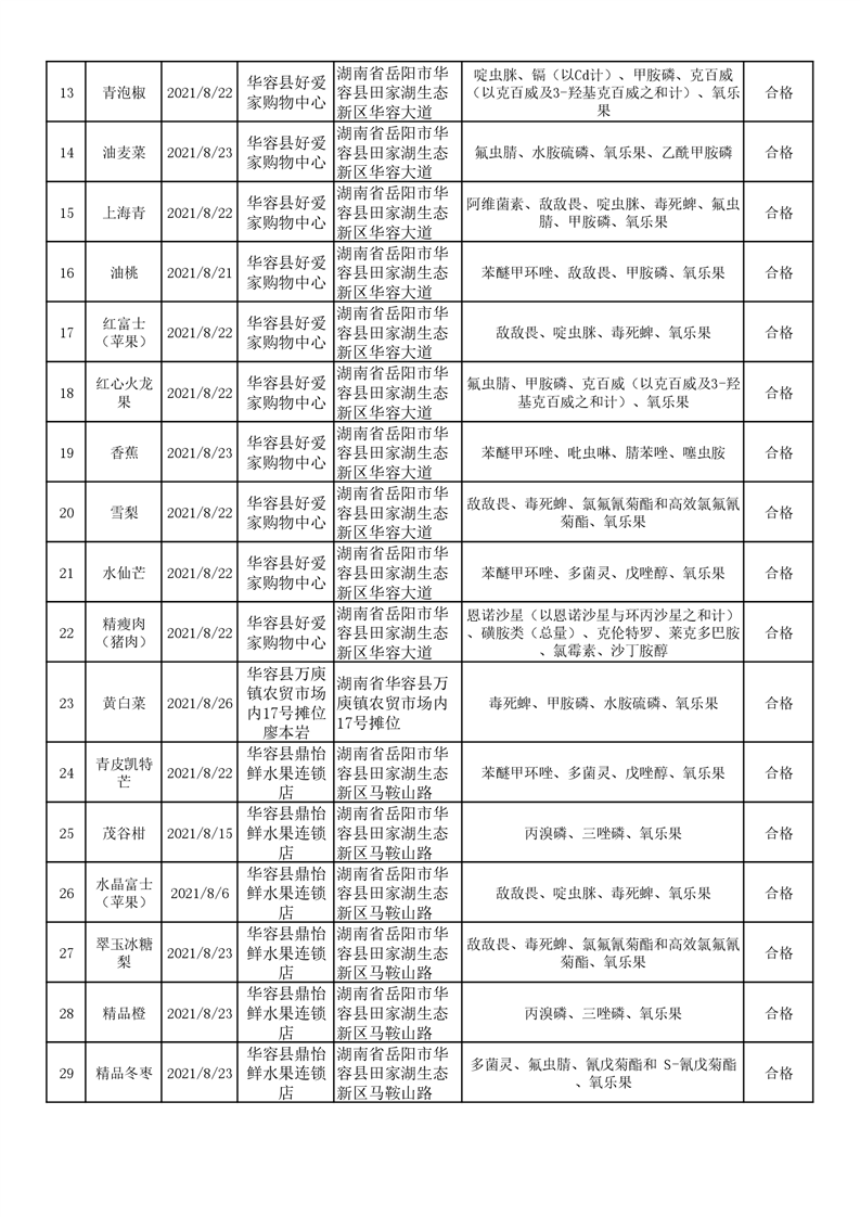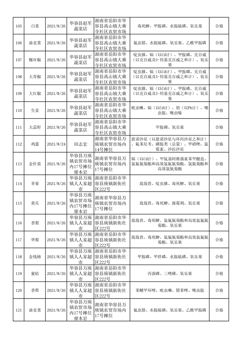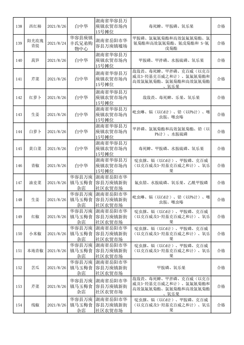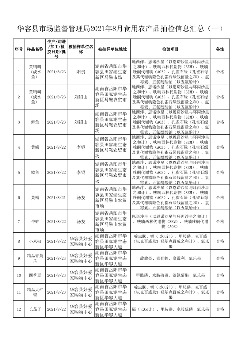 华容县市场监督管理局2021年8月食用农产品抽检信息汇总(一)