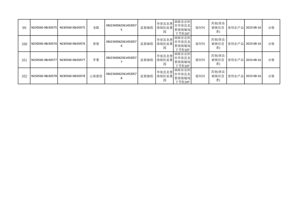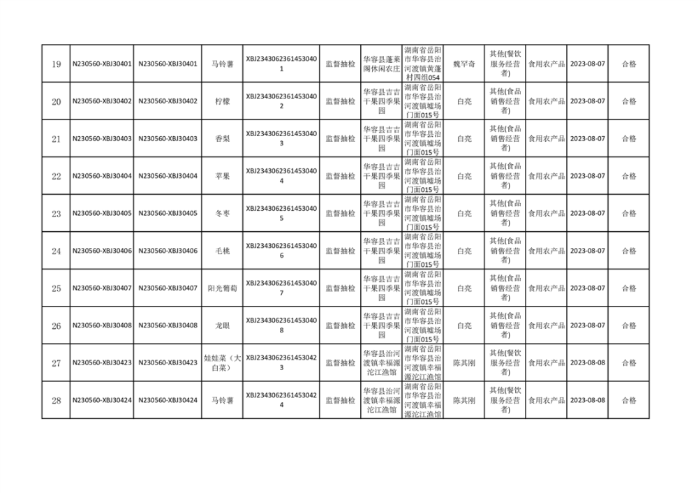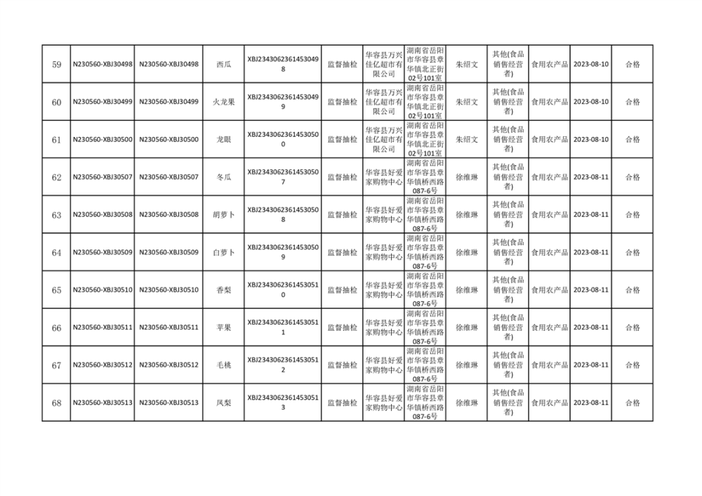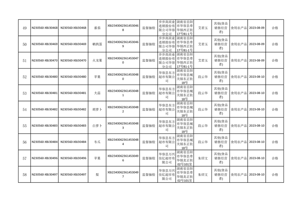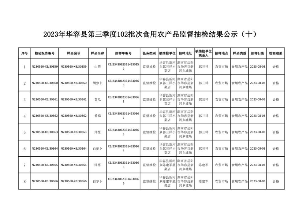 2023年华容县第三季度102批次食用农产品监督抽检结果公示(十)