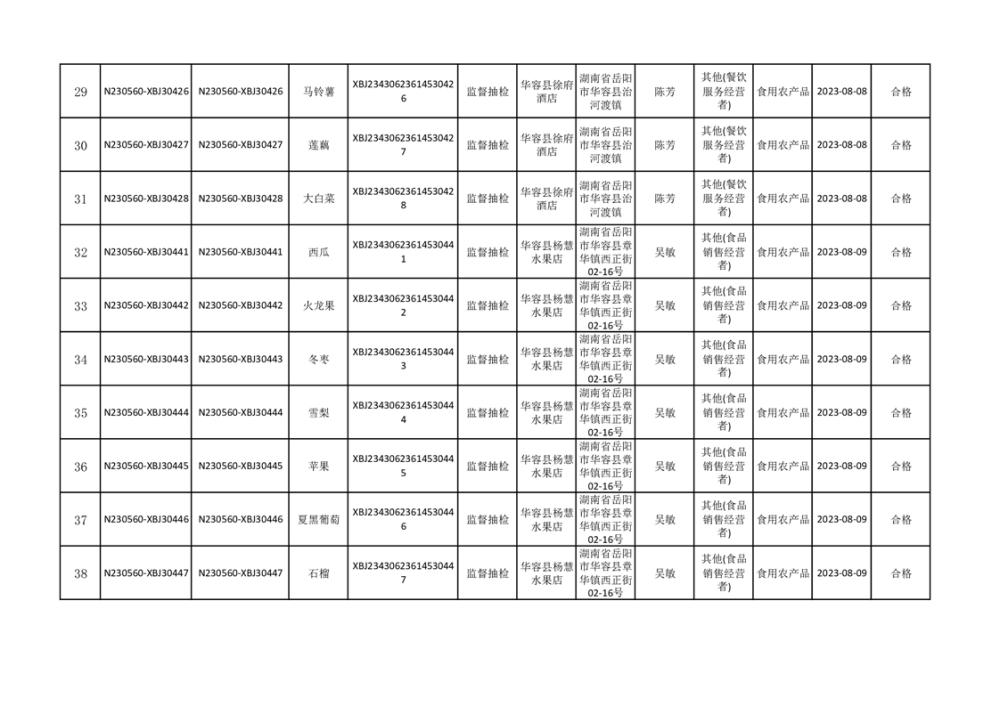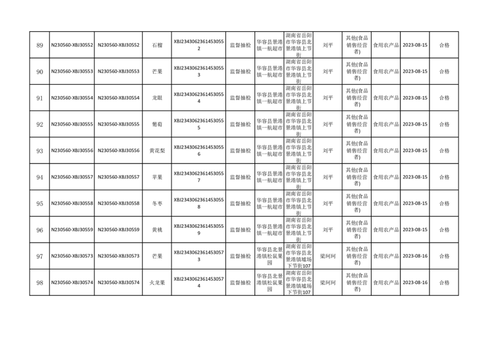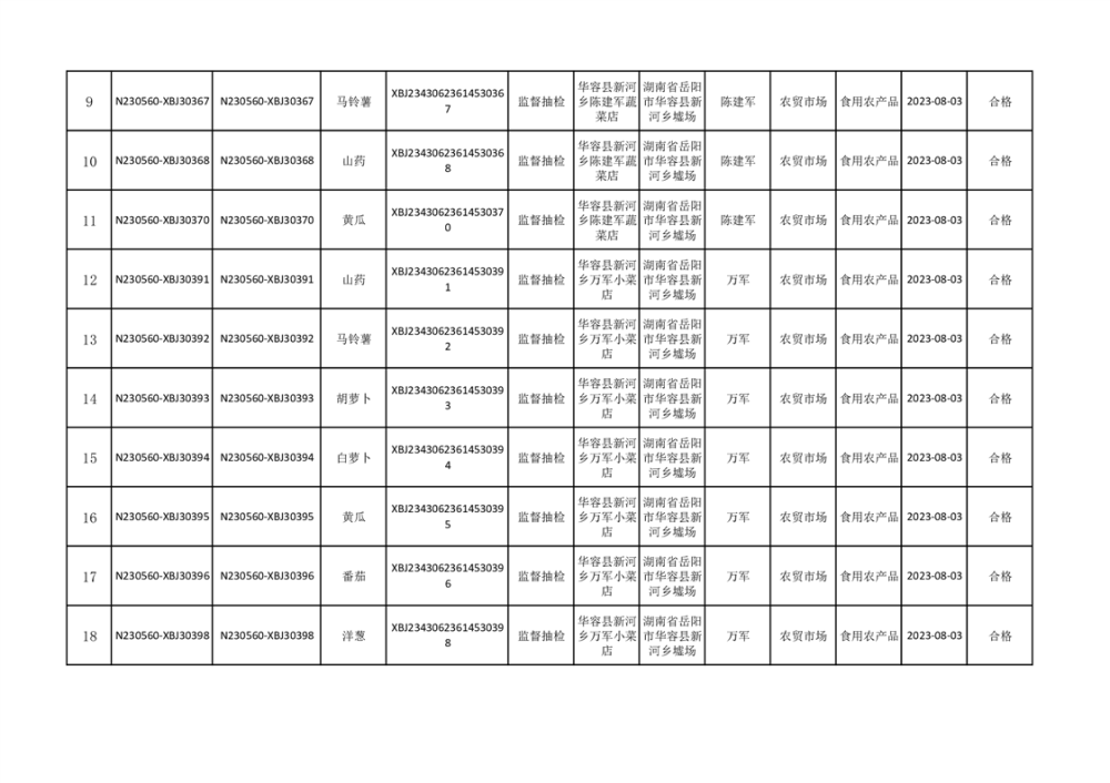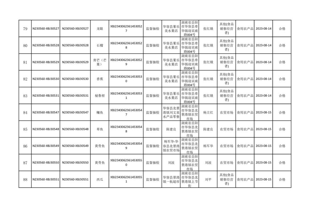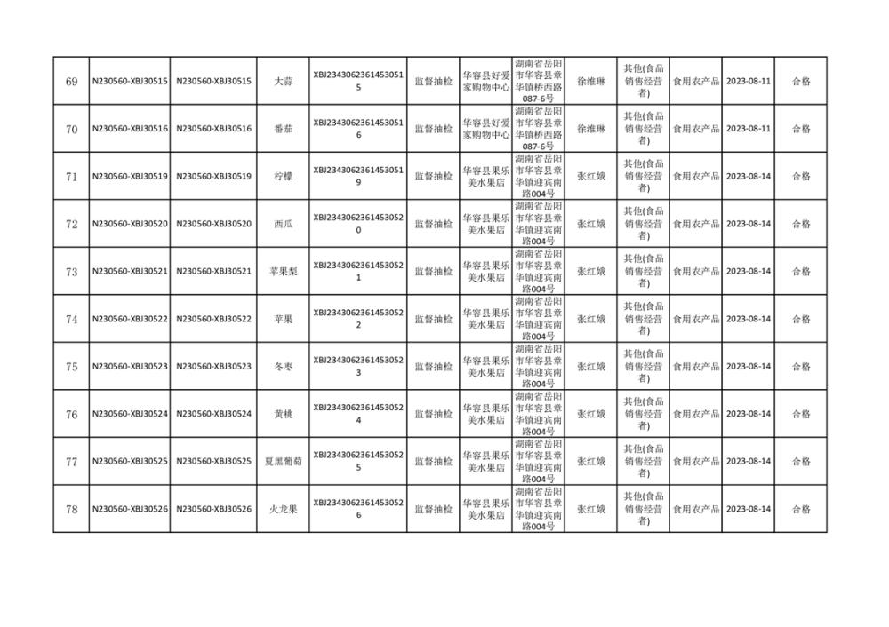 2023年华容县第三季度102批次食用农产品监督抽检结果公示(十)