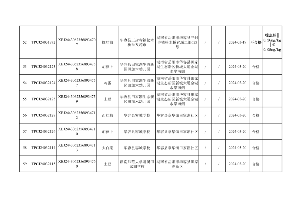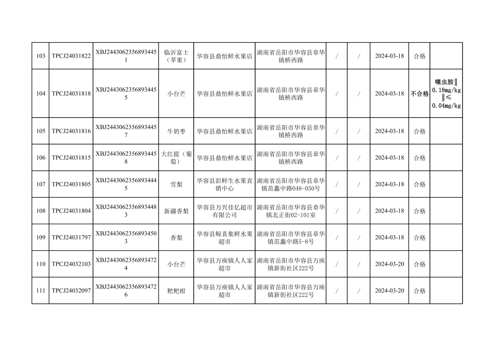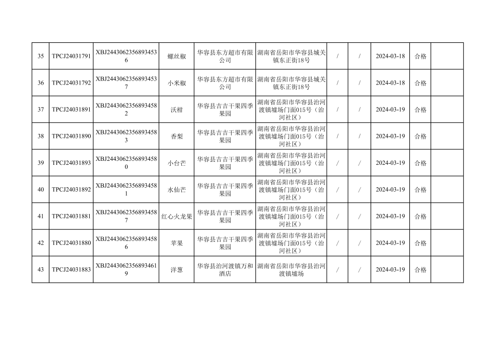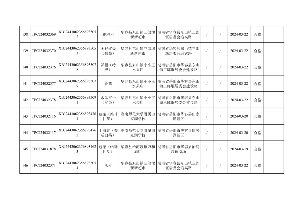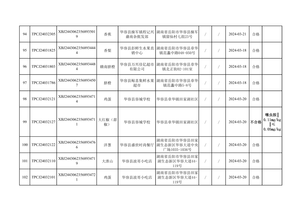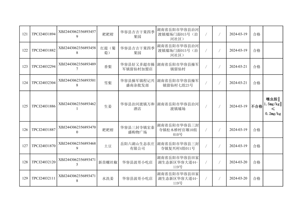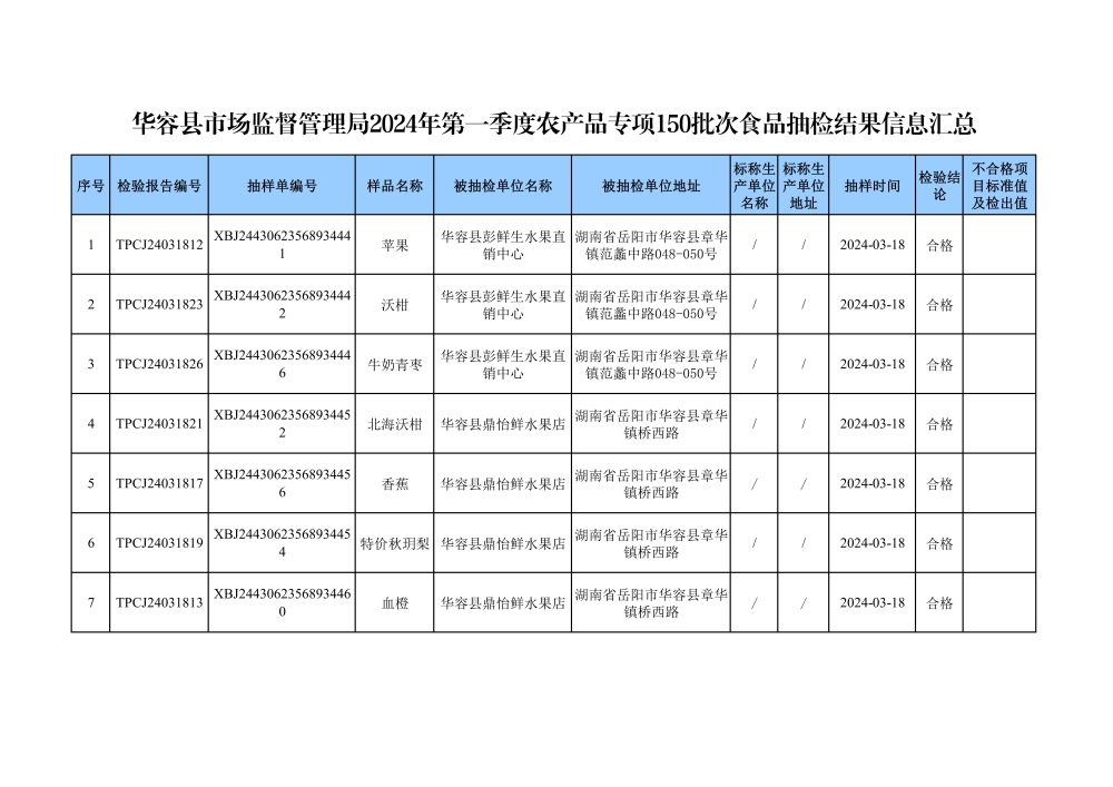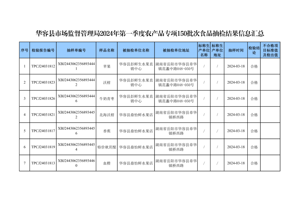华容县市场监督管理局2024年第一季度农产品专项抽检结果汇总(共150批次)